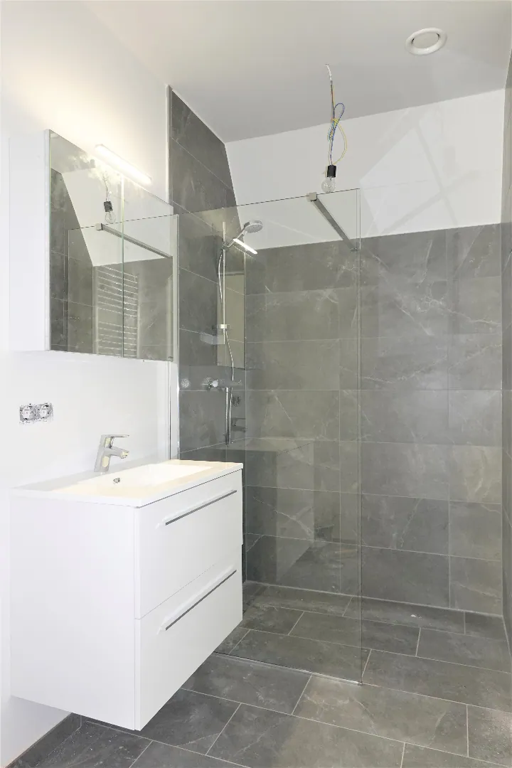 Langs de Koningin Astridlaan vinden we deze nieuwbouw residentie met 4 appartementen. Deze zijn nog in afwerkingsfase en zullen eind september bewoonbaar zijn. Het appartement heeft een inkomhal, 2 slaapkamers, toilet, badkamer met inloopdouche en leefruimte met open keuken. In de berging bevindt zich de warmtepomp als verwarmingstoestel met vloerverwarming. Op het zonnig terras heeft men een mooi uitzicht. Er is een lift aanwezig en brievenbus met code voor pakketleveringen. Men kan een autostaanplaats bijhuren (50€/maand) achteraan het gebouw. Wil je op een goede locatie wonen in een modern appartement boek dan snel je bezoek in!!!!!