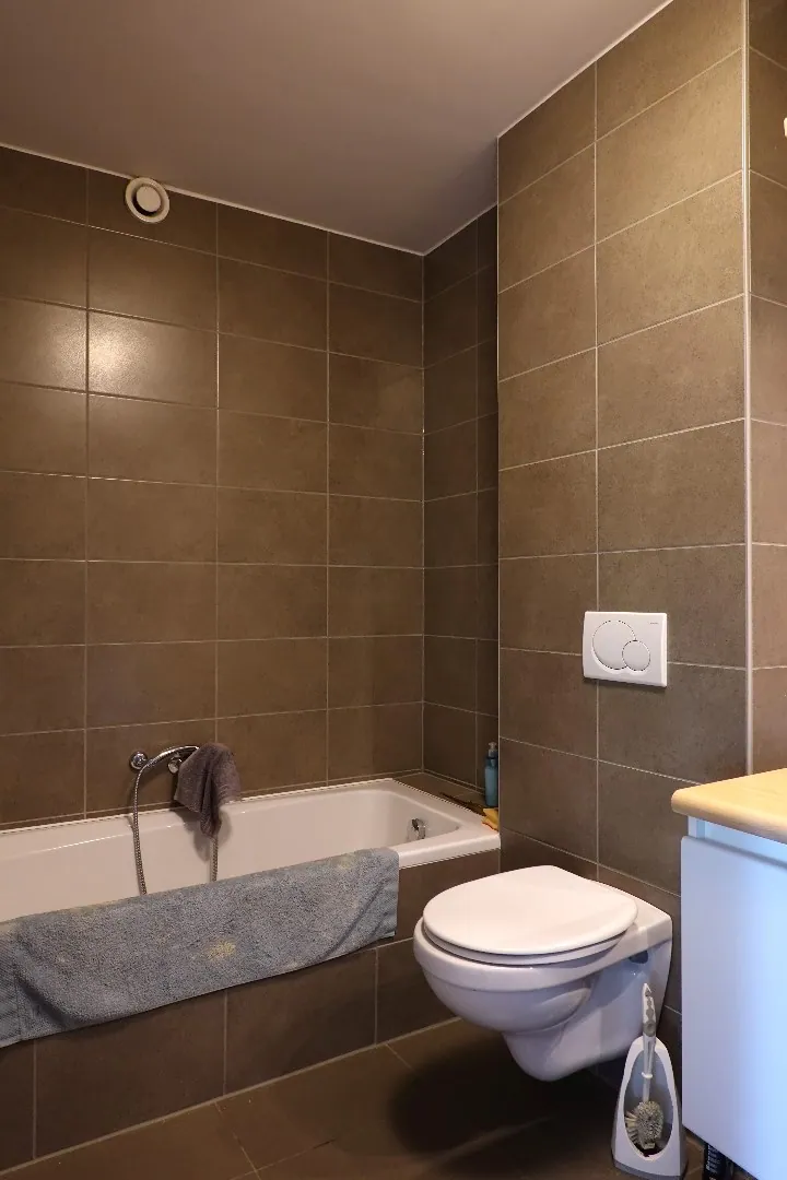 Het appartement wordt ingedeeld met een inkomhal met gastentoilet en een bergruimte, een lichtrijke leefruimte met een geïnstalleerde keuken en twee slaapkamers telkens met aansluitend een badkamer. Bij het appartement is er ook een terras aanwezig waar het heerlijk vertoeven is. Tot slot is er een garagebox bij te huren voor 60 euro per maand.
