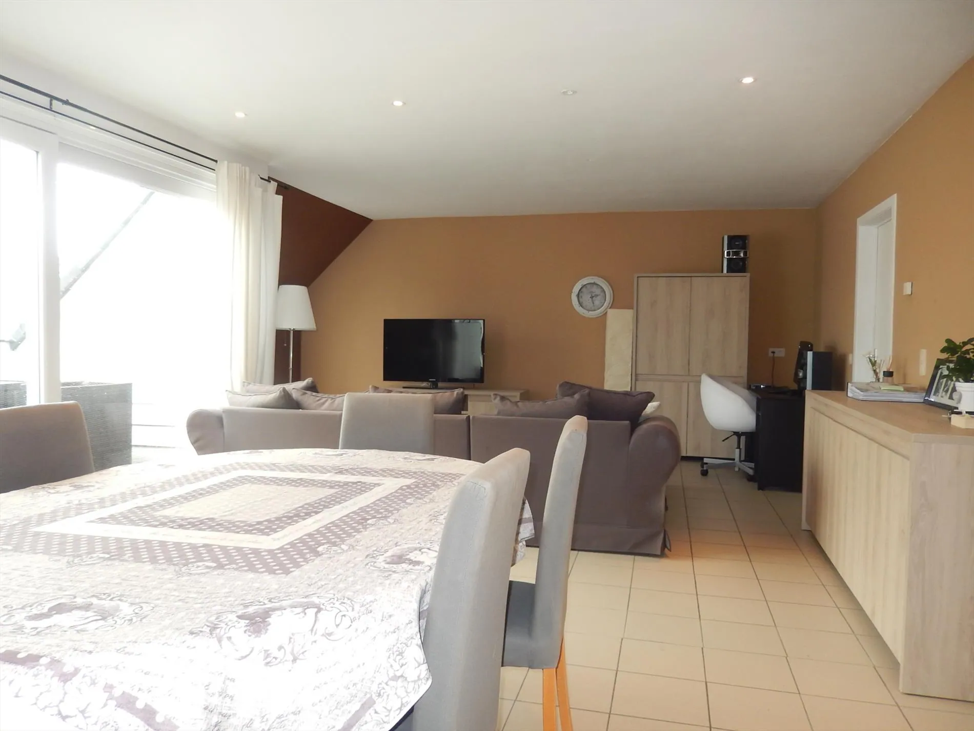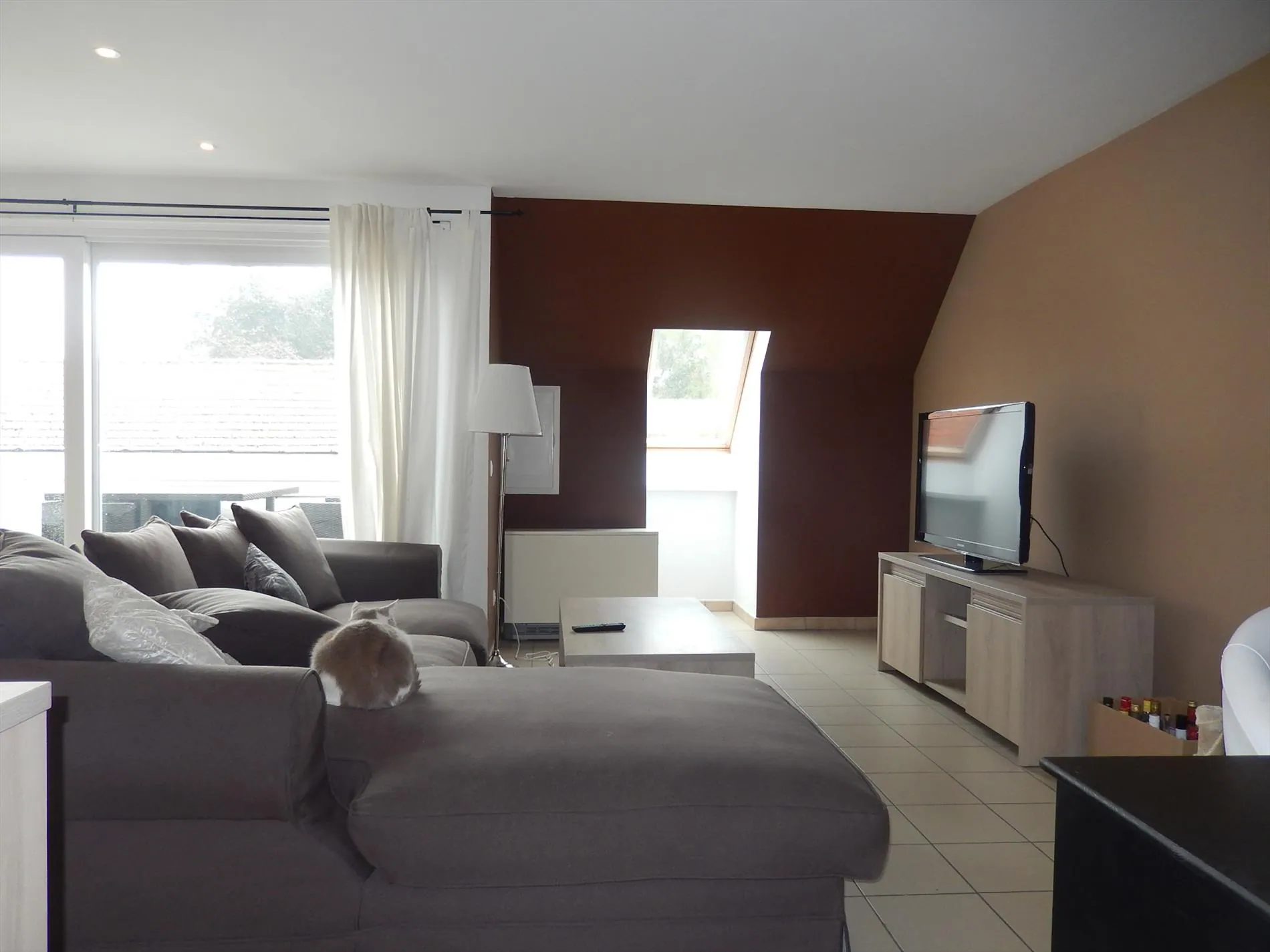 Dit gezellig en lichtrijk dakappartement is gelegen in het centrum van Jabbeke. Het omvat een inkomhal, twee zéér ruime slaapkamers waarvan één met bijhorende badkamer met douche, lichtrijke woonkamer met aanpalend een zuidgericht terras (met 100% privacy), ingerichte keuken, badkamer met ligbad en aansluiting voor was- en droogmachine en een afzonderlijk toilet. Tevens is er in de residentie een gemeenschappelijke tuin en is er een garagebox inbegrepen in de prijs.
