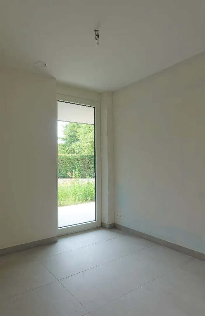 Het gelijkvloers appartement omvat een inkomhal met ruimte voor vestiaire, een gastentoilet, de lichtrijke leefruimte met groot schuifraam naar het aangrenzend terras met tuin, de volledig ingerichte open keuken die uitgerust is met alle comfort, een berging, twee slaapkamers met zicht op de tuin en de badkamer met lavabo en inloopdouche. Het appartement beschikt over zonnepanelen en zal nog volledig geschilderd worden. In de huurprijs is er een ruime garagebox met kelderberging inbegrepen.