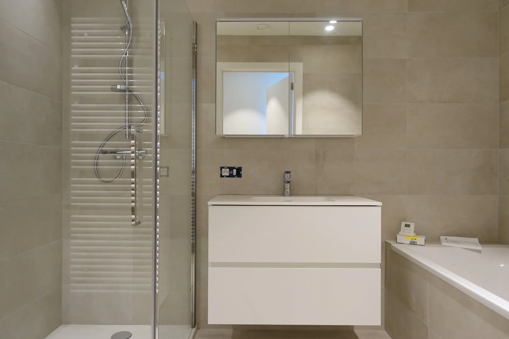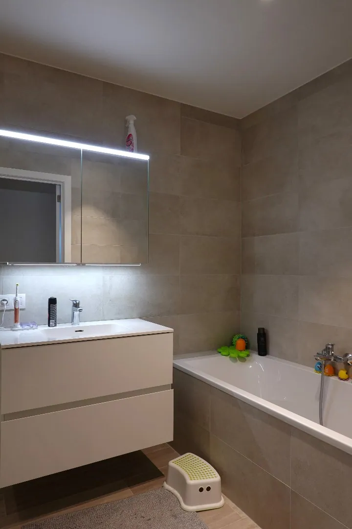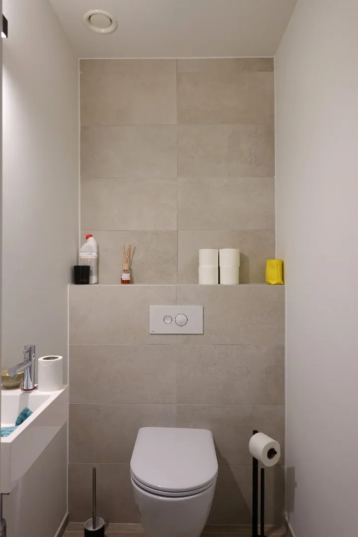 Dit kwaliteitsvol afgewerkt prachtig nieuwbouwappartement met een groot en zonnig terras van 50 m² is gelegen op een uitstekende locatie in Jabbeke en is voorzien van zonnepanelen. Het appartement bevindt zich op de eerste verdieping aan de achterzijde van het gebouw en wordt ingedeeld met een inkomhal met gastentoilet, een ruime lichtrijke leefruimte met een open en volledig ingerichte keuken, twee slaapkamers, een badkamer met ligbad en douche en tot slot een bergruimte. Het groot en zonnig terras, waar het heerlijk vertoeven is, is te bereiken via het grote schuifraam in de leefruimte. Bij het appartement is er een garagebox beschikbaar voor € 60 per maand en is er ook een gemeenschappelijke fietsenberging aanwezig.