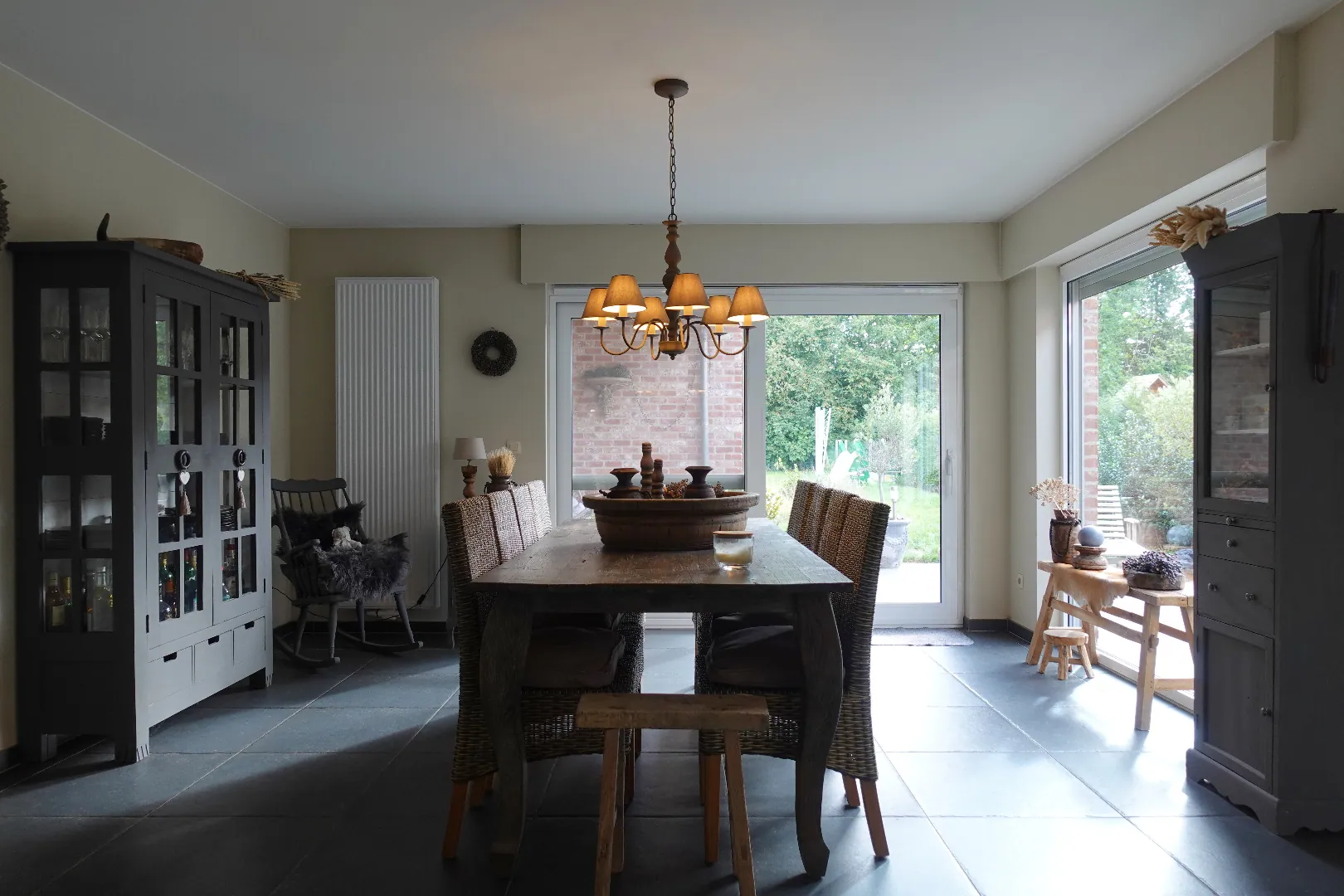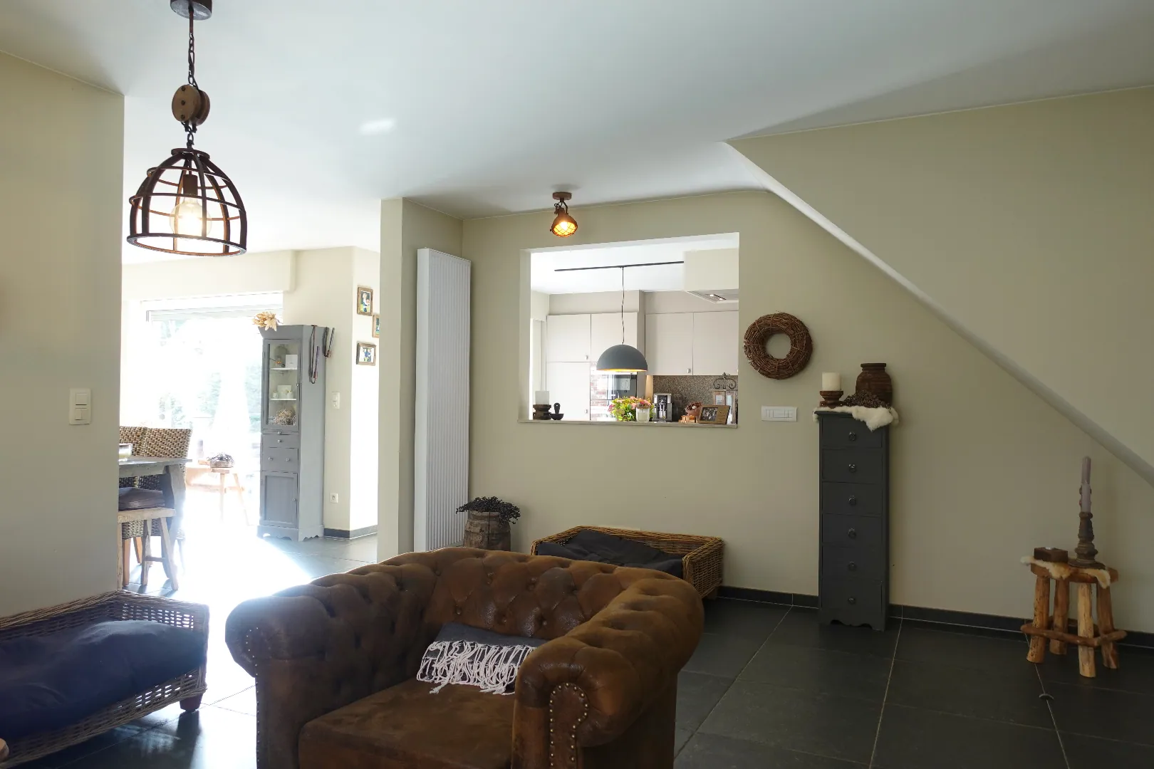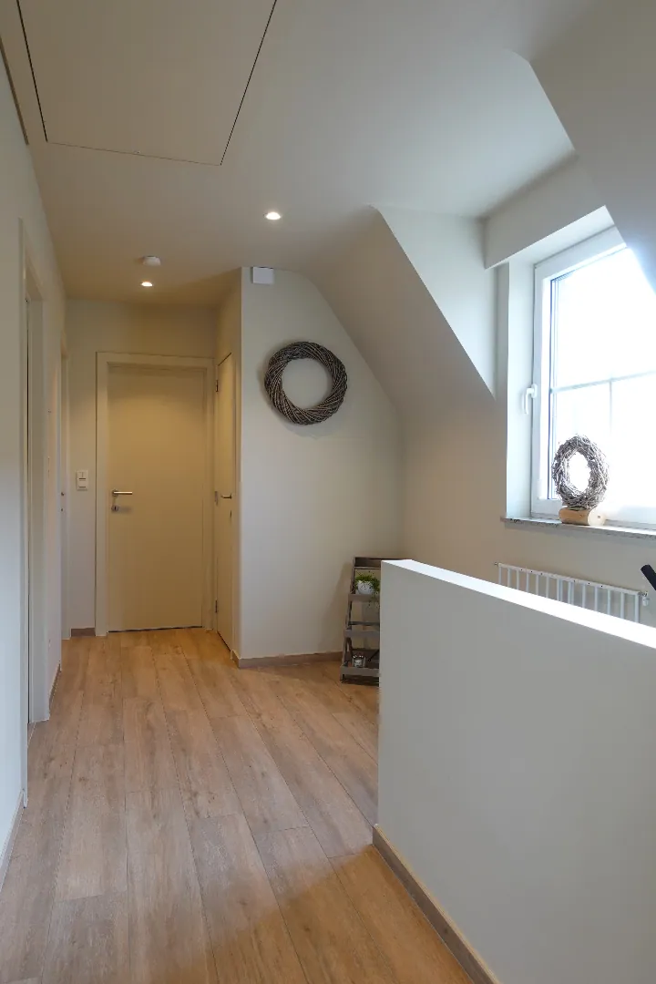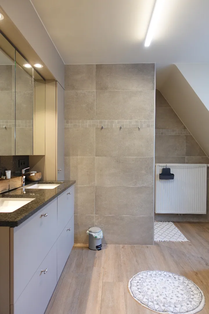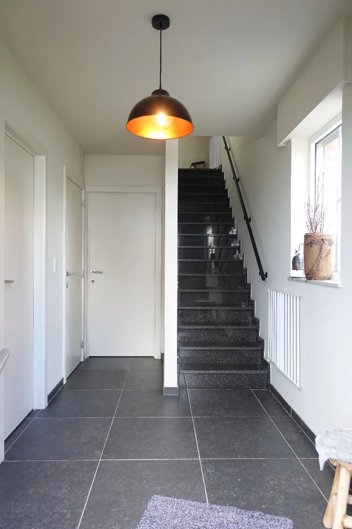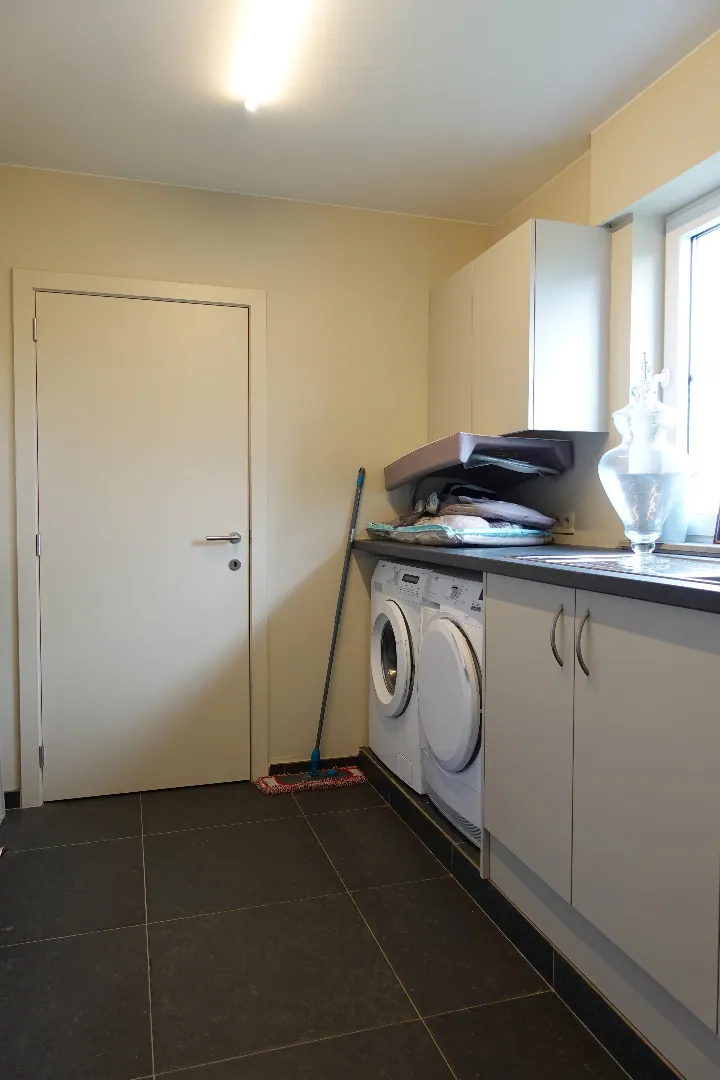 Gelegen langs de Aartrijksesteenweg te Jabbeke, op enkele minuten van alle winkels en voorzieningen treffen we deze prachtige villa aan. De woning wordt ingedeeld in een inkomhal met toilet, bureauruimte die kan ingericht worden als slaapkamer, woonkamer met lichtrijke eetplaats, volledig ingerichte keuken, wasplaats en dubbele garage. De eerste verdieping wordt ingedeeld in een nachthal, 1 badkamer met dubbele lavabo, bad en inloopdouche, 3 slaapkamers, toilet. Daarnaast is er nog een gezellige achtertuin met overdekt terras. Kom deze absolute topper snel ontdekken!