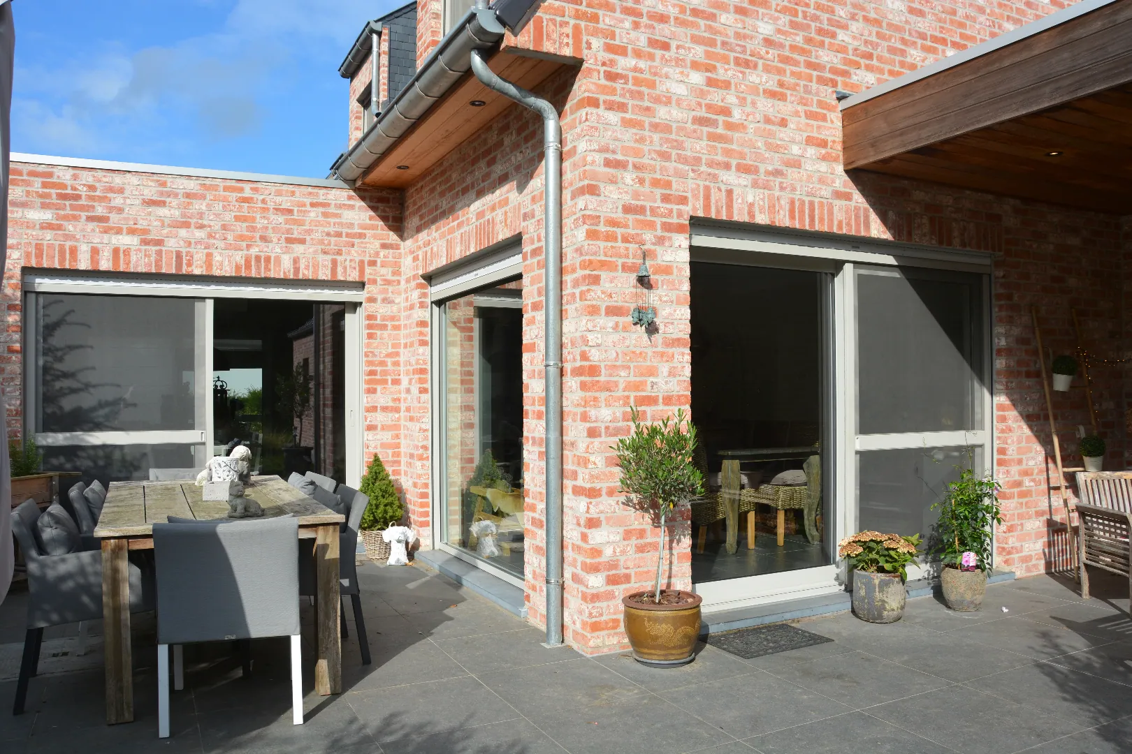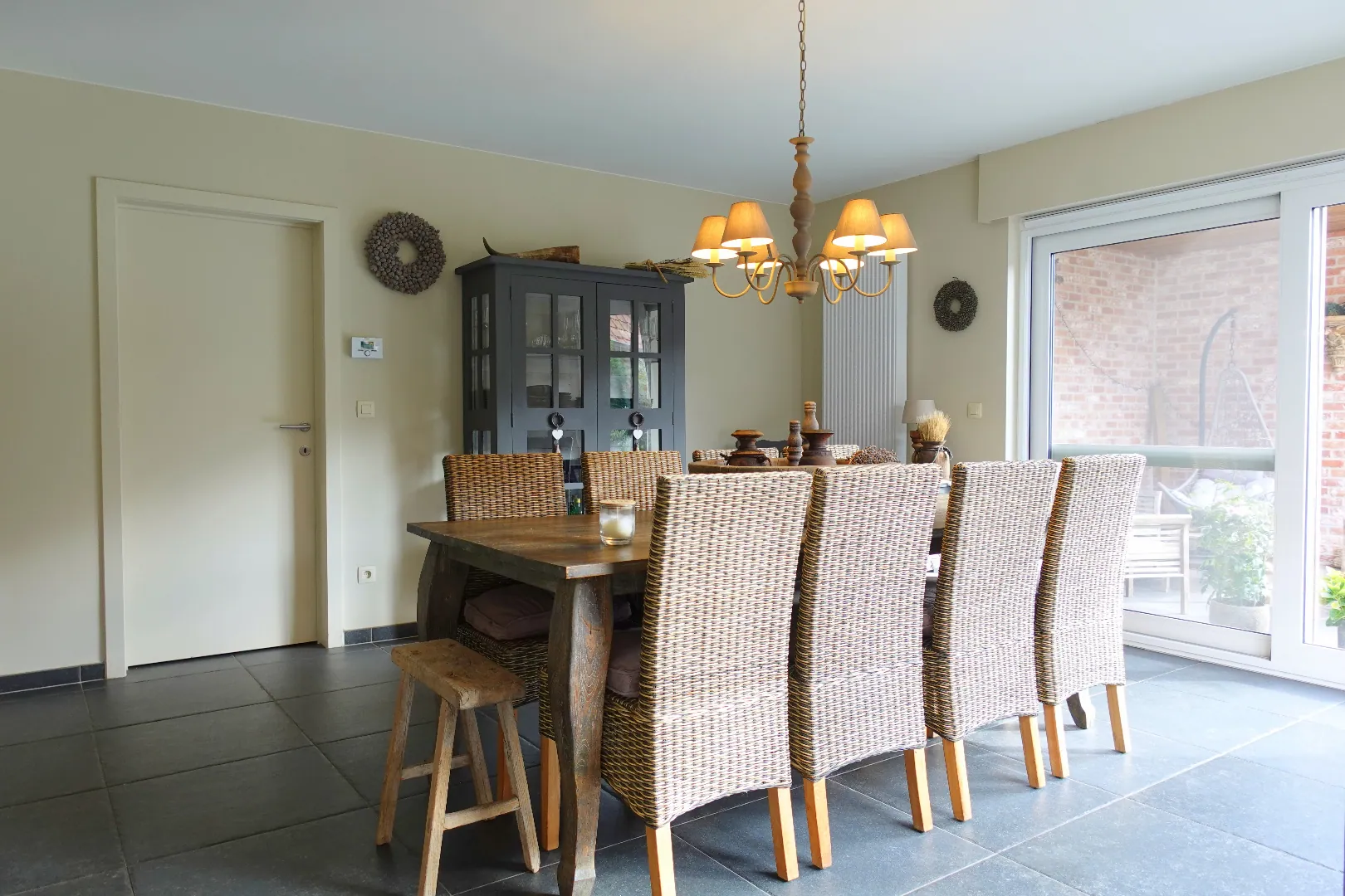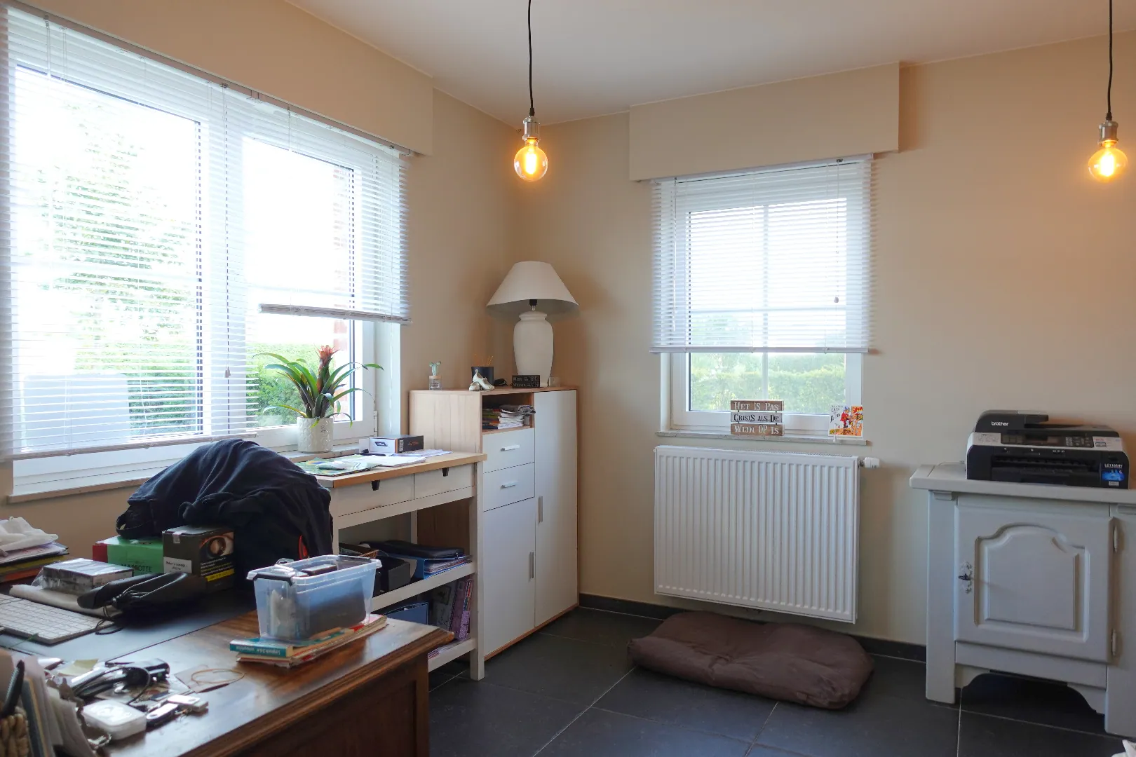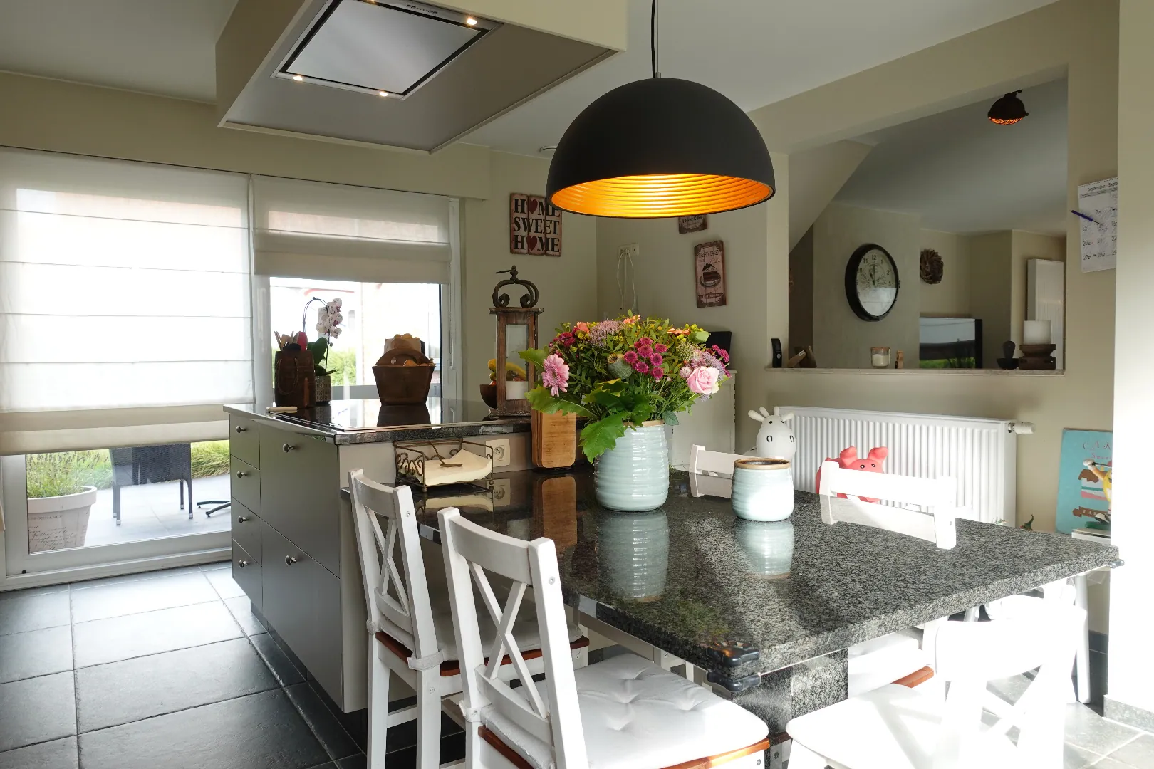 Gelegen langs de Aartrijksesteenweg te Jabbeke, op enkele minuten van alle winkels en voorzieningen treffen we deze prachtige villa aan. De woning wordt ingedeeld in een inkomhal met toilet, bureauruimte die kan ingericht worden als slaapkamer, woonkamer met lichtrijke eetplaats, volledig ingerichte keuken, wasplaats en dubbele garage. De eerste verdieping wordt ingedeeld in een nachthal, 1 badkamer met dubbele lavabo, bad en inloopdouche, 3 slaapkamers, toilet. Daarnaast is er nog een gezellige achtertuin met overdekt terras. Kom deze absolute topper snel ontdekken!