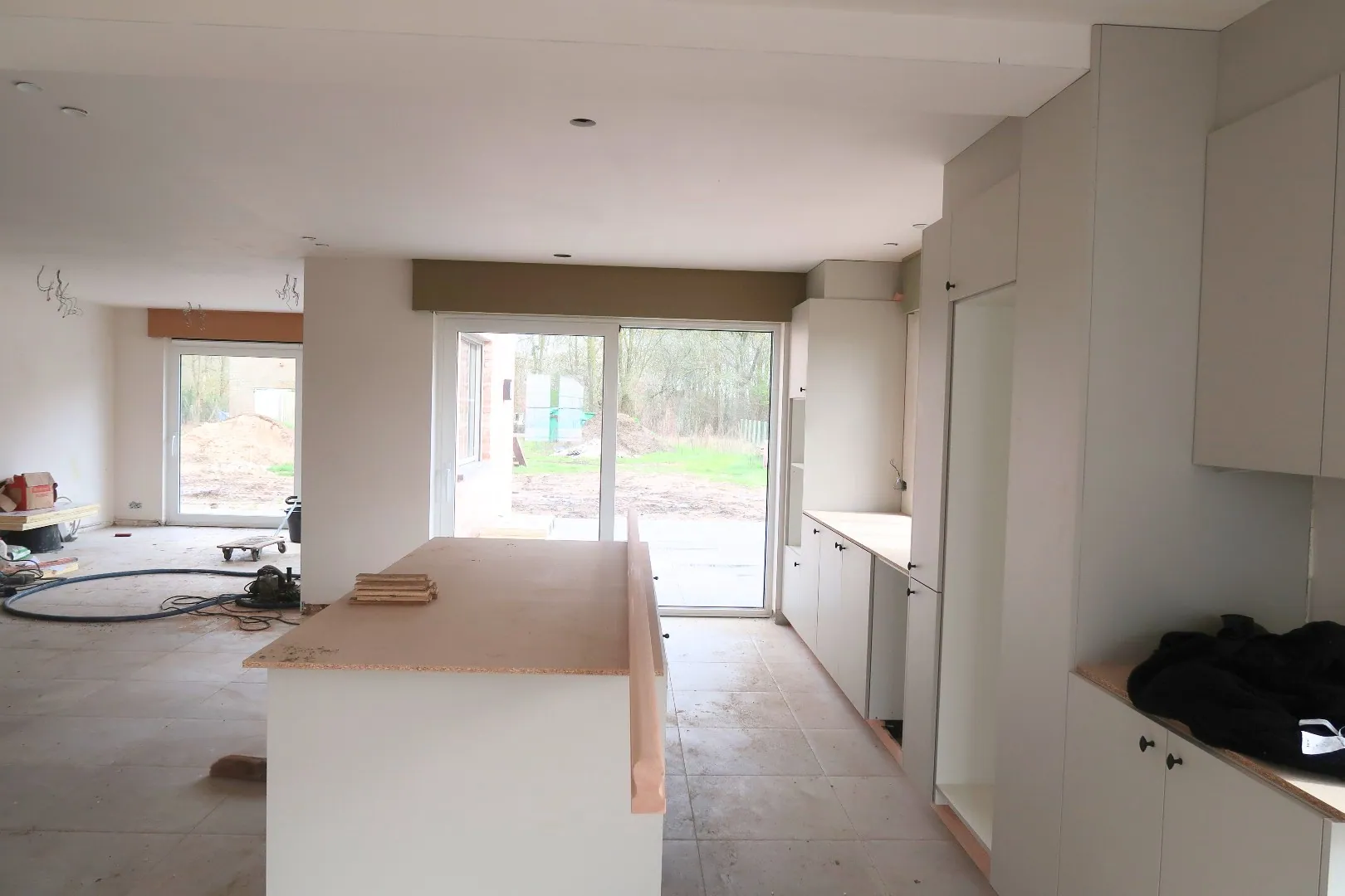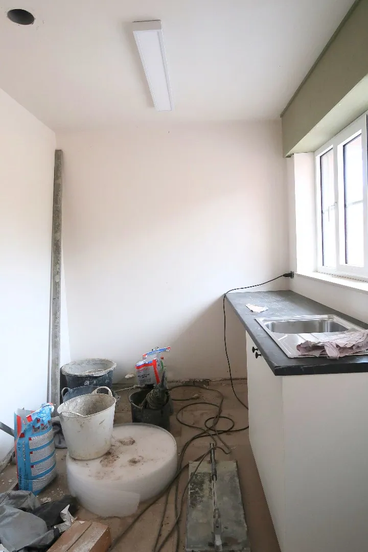 Op het gelijkvloers bevindt zich een zeer ruime en lichtrijke woonkamer die naadloos aansluit op een grote, volledig uitgeruste keuken. Daarnaast is er een praktische berging, een aparte wasplaats en een garage, wat zorgt voor extra comfort en opbergruimte.