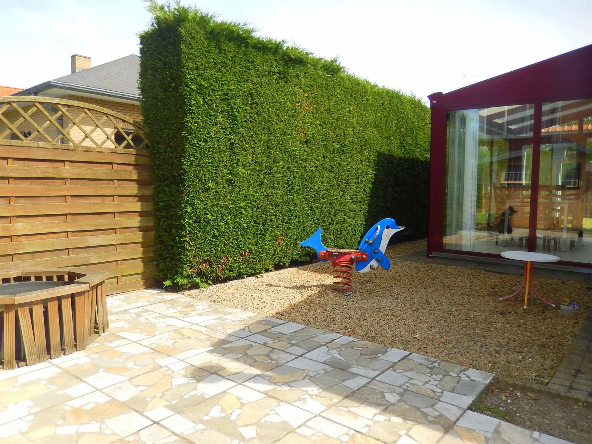 Deze charmante woning omvat een gezellige woonkamer met gashaard, keuken, inkomhal, badkamer met ligbad, lavabomeubel en toilet, 2 veranda's, nachthal, 3 slaapkamers en een berging. De lichtrijke woning is instapklaar en omgeven door een mooie zonnige tuin. De woning bevat ook een ruime garage en een tuinhuis. Wat deze woning zo uniek maakt, is de 'zuiderse touch', wat een vakantiegevoel weergeeft. Vlotte bereikbaarheid, op een boogscheut verwijderd van het dorp Jabbeke en de grote invalswegen en op wandelafstand van de bushalte. Beschikbaar vanaf 1 juli.