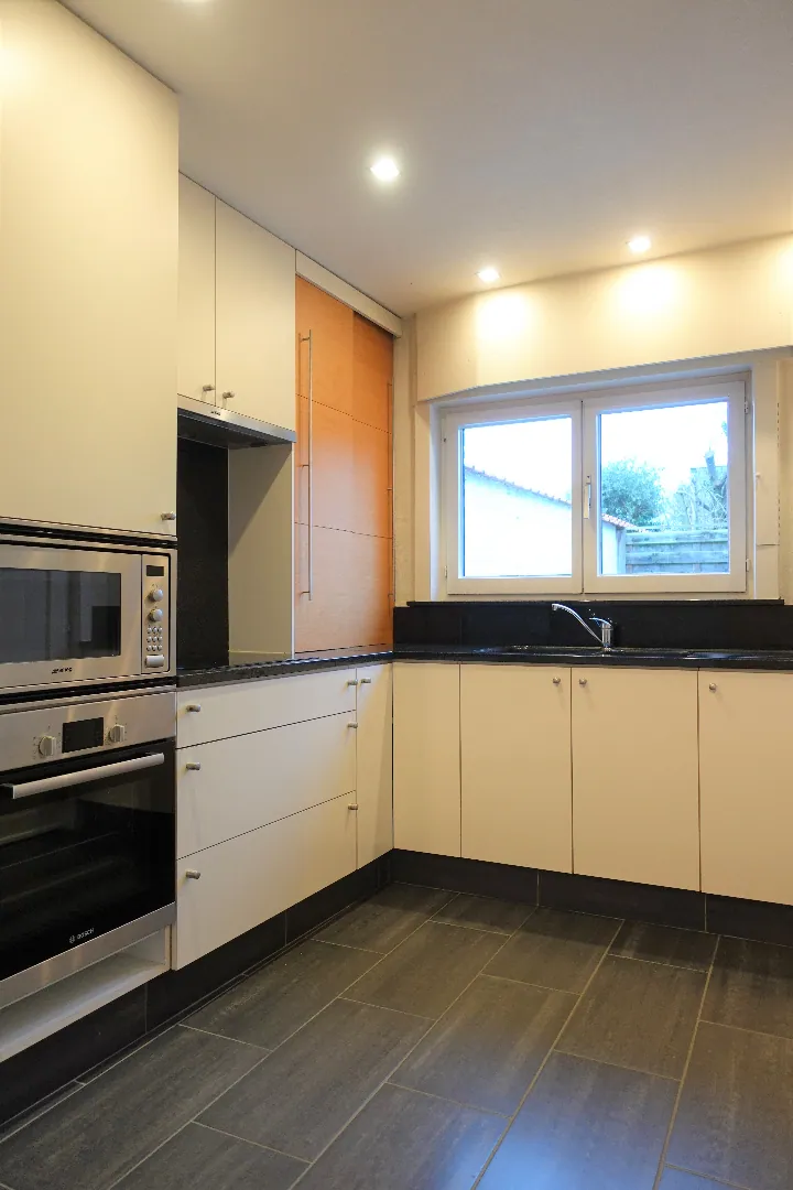 De woning werd reeds uitgerust met dubbele beglazing, centrale verwarming op aardgas en een geïsoleerde zolder en wordt samengesteld uit een inkomhal met vestiairekast, ruime woonkamer met parketvloer, een volledig ingerichte keuken, een ruime tussenhal met apart toilet en de inpandige garage van 16m². De eerste verdieping biedt plaats aan de centrale nachthal, 2 volwaardige dubbele slaapkamers met ingemaakte kastenwand, een derde slaapkamer, badkamer met inloopdouche en tweede toilet en tot slot een praktische bergruimte. De ruime bergzolder is bereikbaar via de valtrap in de nachthal.
