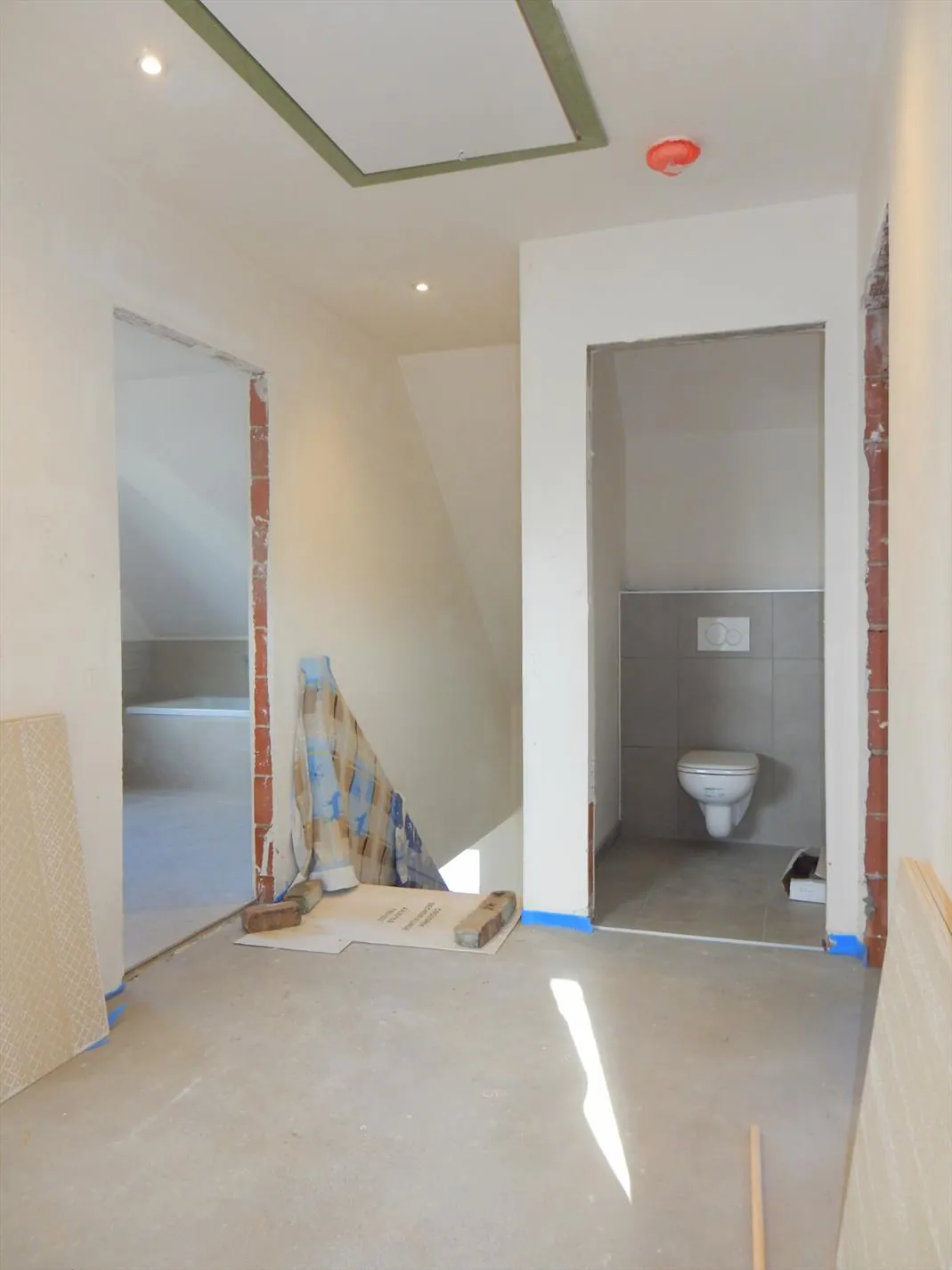 Deze woning met zuid-gerichte tuin omvat op het gelijkvloers een ruime inkomhal met gastentoilet, een lichtrijke woonkamer met zicht op de zonnige tuin en een volledig geïnstalleerde keuken met toegang naar de garage. In de garage is er een aansluiting voor een wasmachine aanwezig. Op de eerste verdieping bevindt zich een nachthal, 3 slaapkamers, een apart toilet en een badkamer met ligbad en douche. Er is ook een ruime zolder aanwezig van 8m op 3,40m. Bel ons om deze moderne nieuwbouwwoning te bezoeken.
