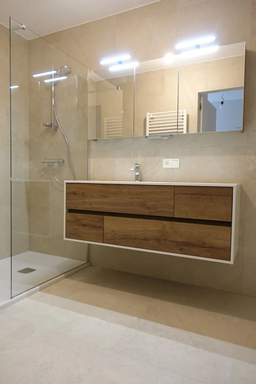 Centrale inkomhal, het apart toilet met wastafel, de lichtrijke leefruimte met aanpalend de moderne open keuken met ontbijthoek, de dubbele slaapkamer, de ruime badkamer, een praktische berging en het zuidelijk gelegen terras.