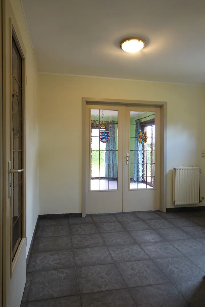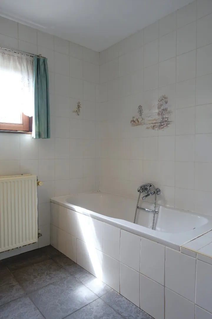 Net buiten de dorpskern van Zerkegem treffen we deze toffe alleenstaande woning in bungalowstijl. De woning werd gebouwd op een groen perceel van 557m² die zich in de breedte uitstrekt. De eigendom werd gebouwd in 1997 en wordt momenteel ingedeeld in een ruime inkomhal met karaktervolle deurpartijen, een apart toilet met lavabo, de grote leefruimte met sfeervolle schouw en zicht op de groene tuin, de open (ingerichte) keuken, de technische berging/wasplaats, de badkamer met ligbad en de 2 slaapkamers. De zolder is toegankelijk via een schuiftrap in de technische ruimte. Verder geniet de woning van tuin-rond-om rond met een tuinhuis, parkeerplaatsen en met zicht op de achterliggende weide.