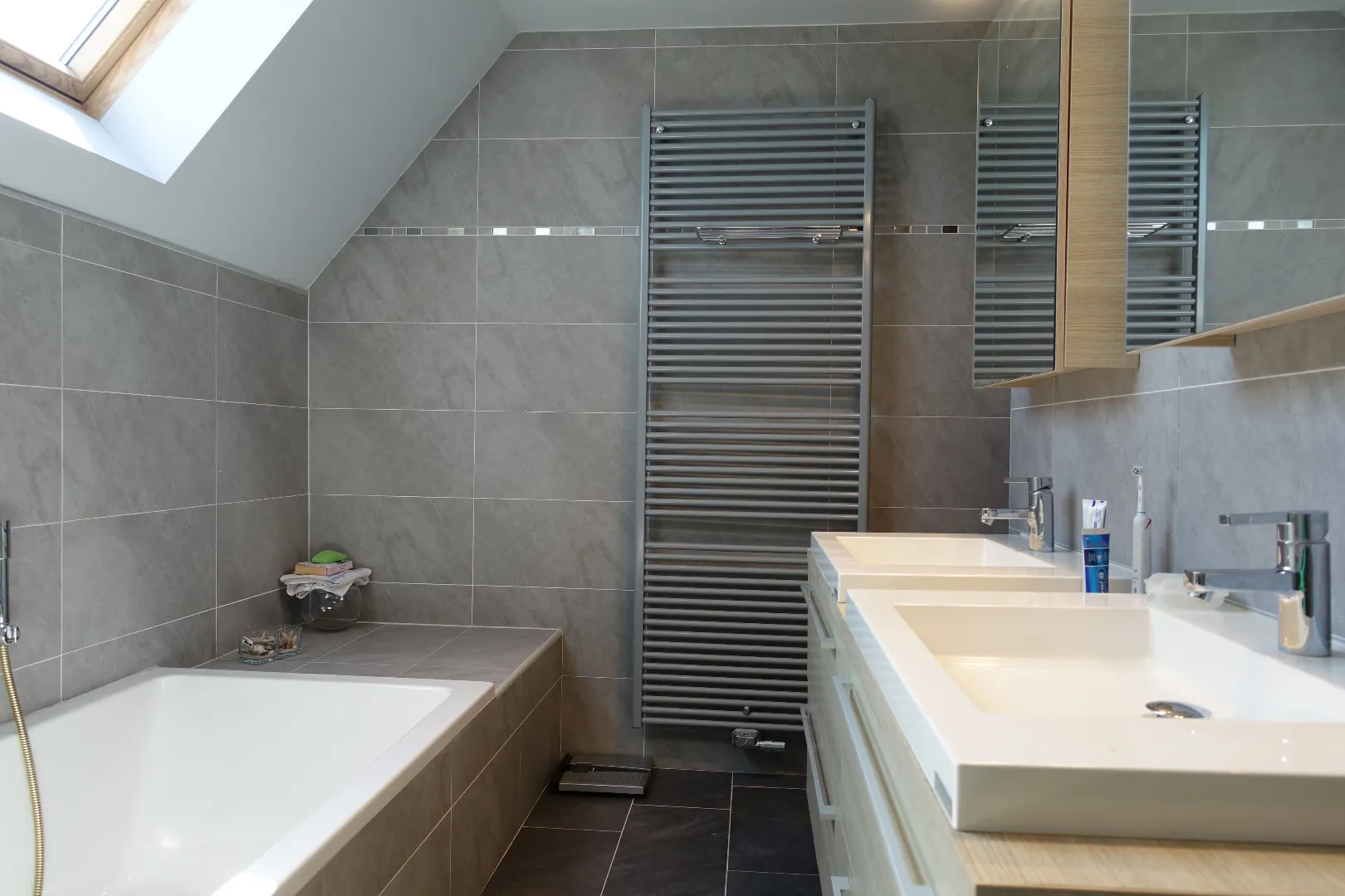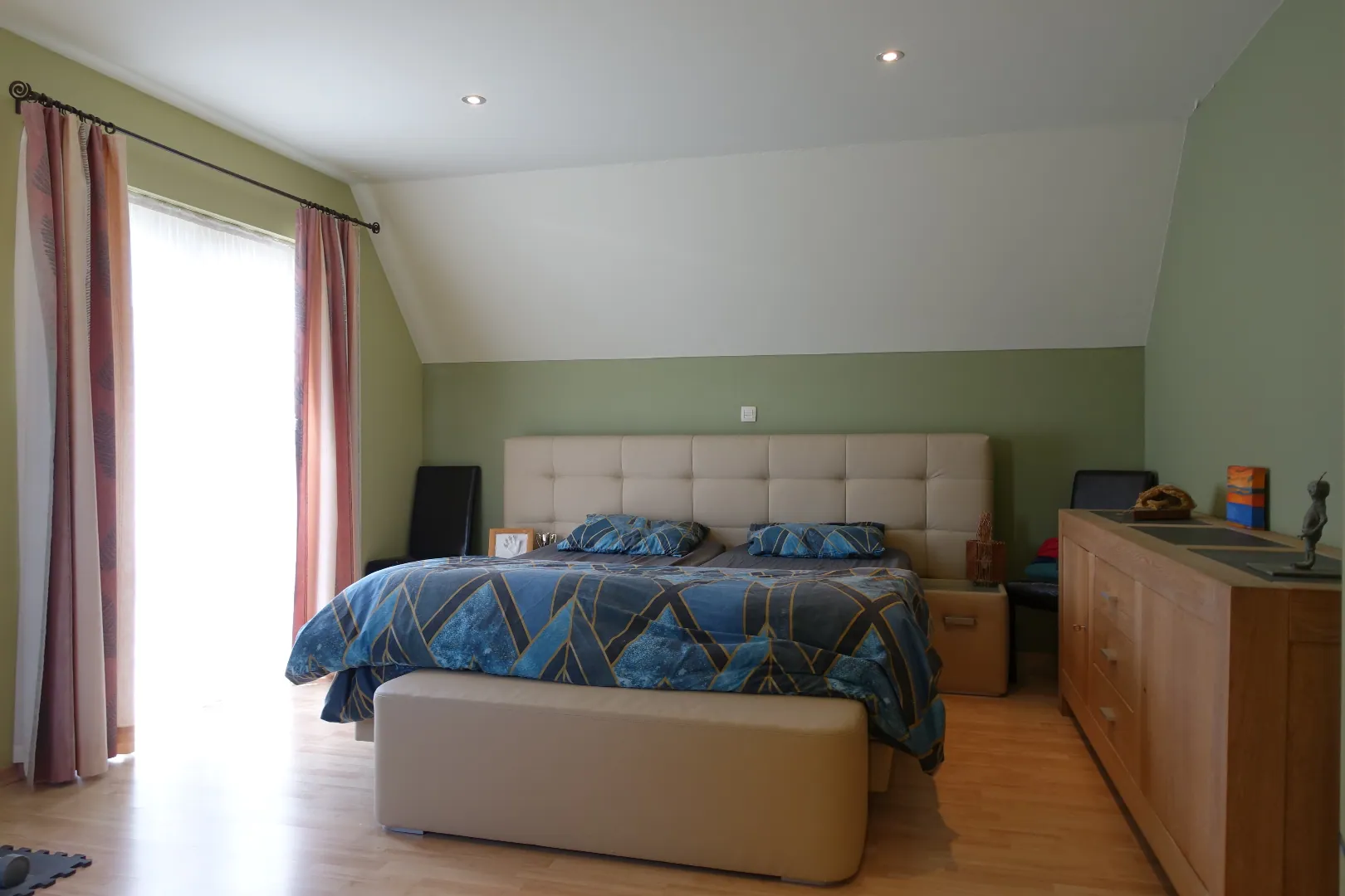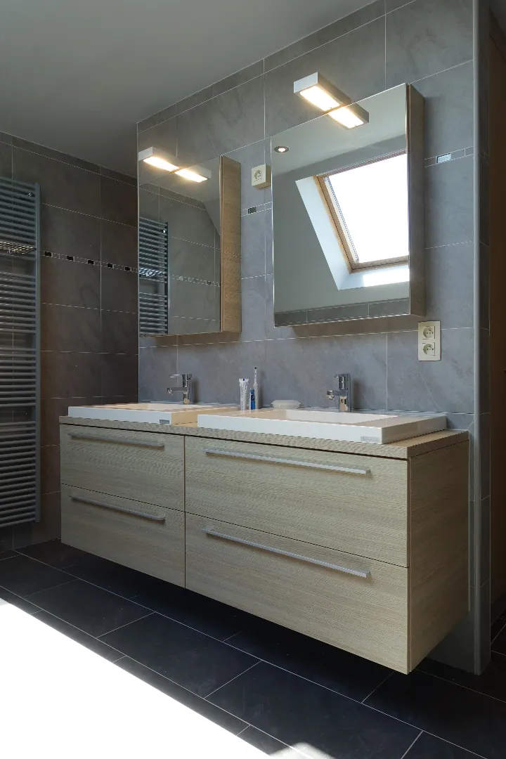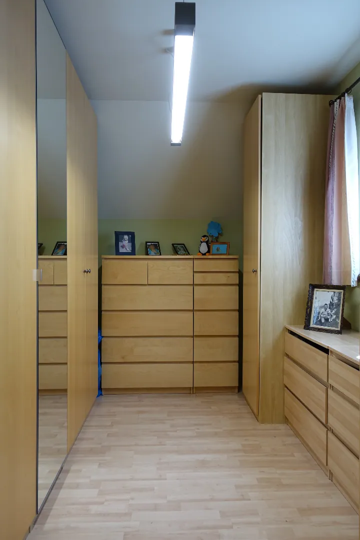 Op het eerste verdiep treffen we de open nachthal, de master bedroom met dressing, de kwalitatief afgewerkte badkamer met ligbad en inloopdouche, 2 ruime slaapkamers, apart toilet en afzonderlijke bergruimte. De grote bergzolder (48m²) is bereikbaar via het zolderluik.