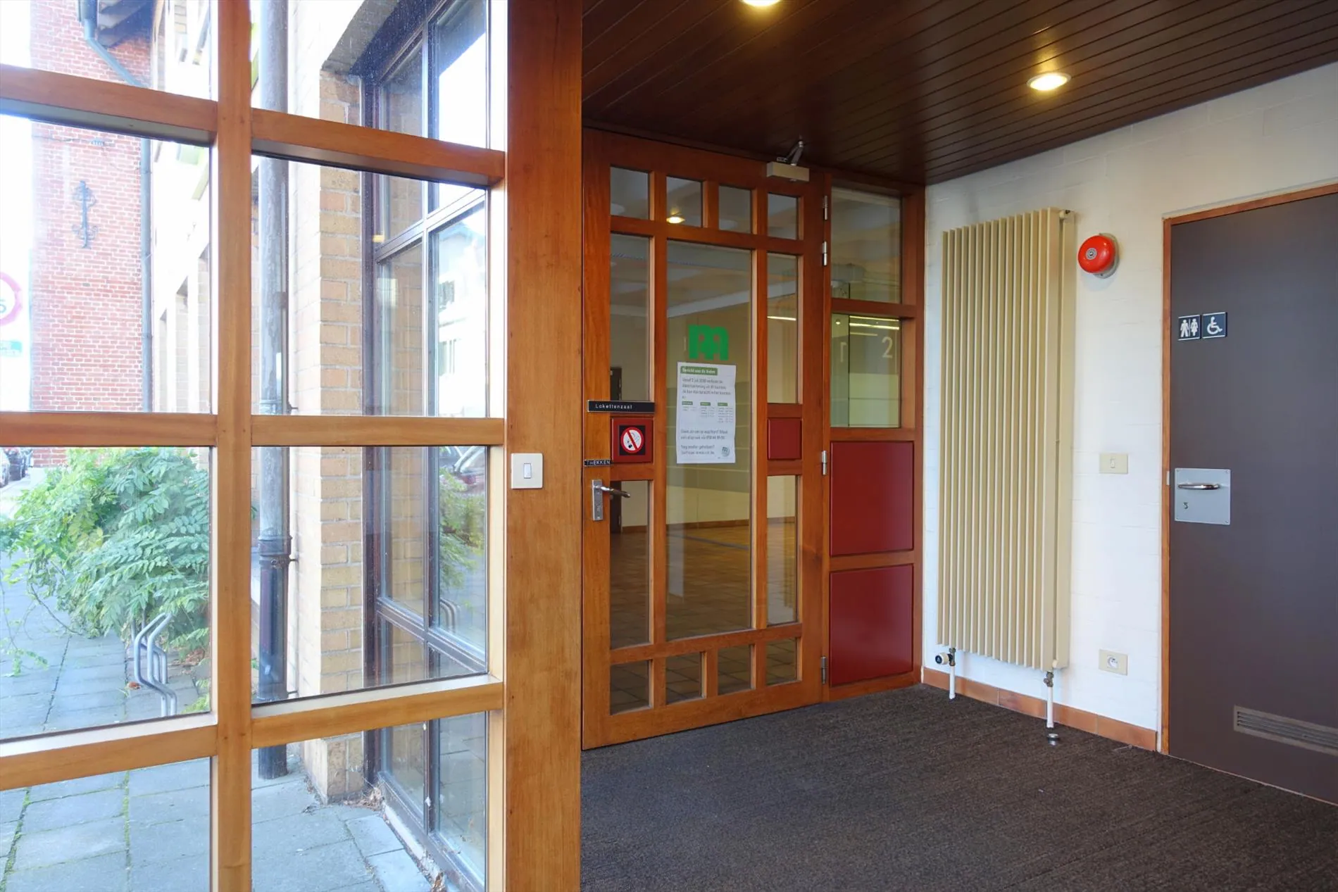 De gelijkvloerse verdieping bestaat momenteel uit een ruime inkom/sas met aparte sanitaire voorziening, een ruime ontvangstruimte, 2 kantoren met glazen wanden, het CV-lokaal, een aparte keuken met sanitair, 2 aparte kantoren met veiligheidsdeur en tot slot de ruime kelderverdieping die toegankelijk is vanuit de keuken. Verder geniet het handelspand nog van een private parking achteraan het gebouw die afgesloten wordt door een poort.