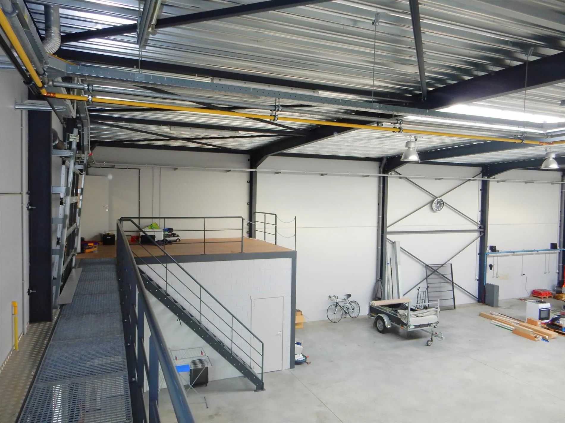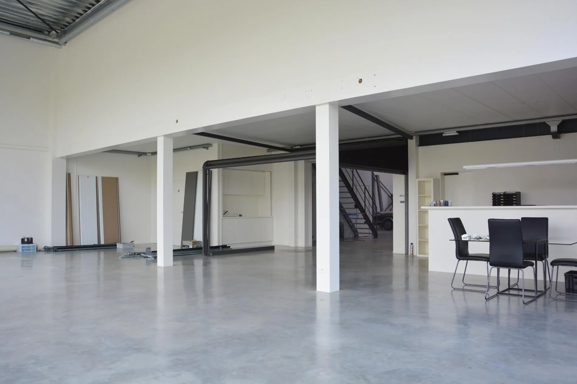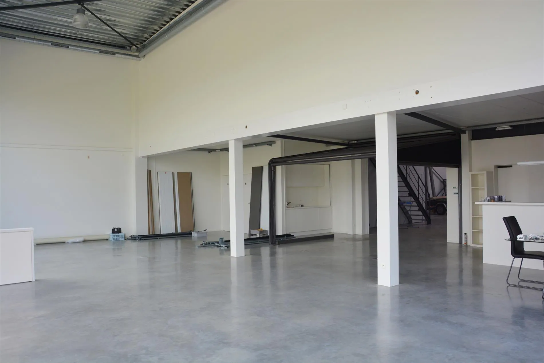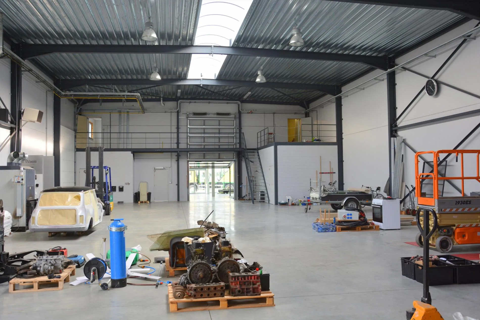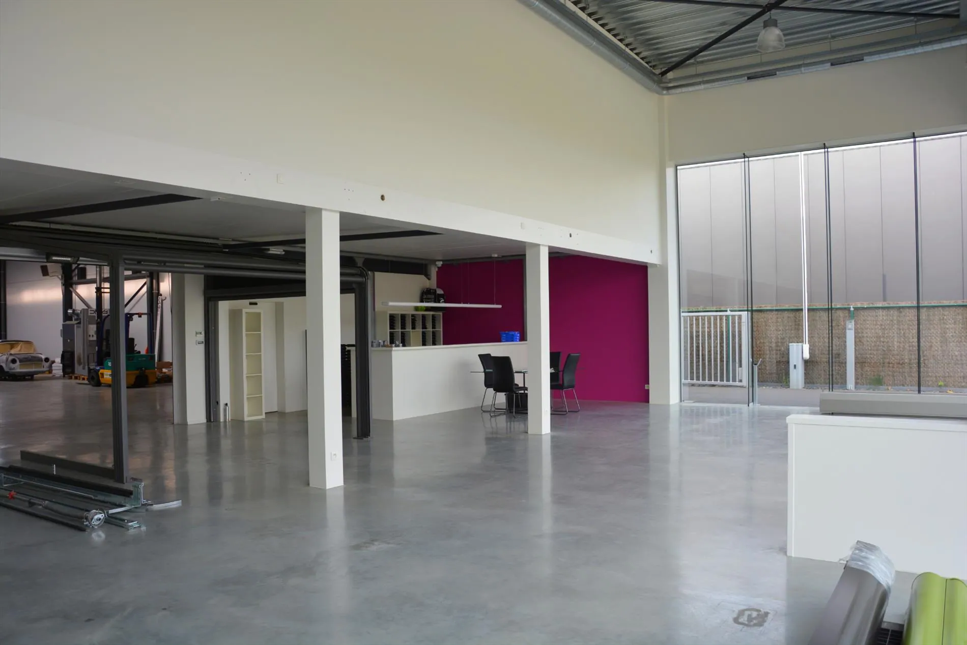 Dit bedrijfsgebouw is volledig nieuw en is opgesplitst in een lichtrijke toonzaal van 160m² met loods/atelier/hangar van 410m². De toonzaal is uitgerust met een keuken, archiefruimte, toilet, bureel, vloerverwarming en ventilatie. De hangar is uitgerust met een grote houtkachel, afzonderlijk toilet, 2 bergruimtes waaronder 1 voorzien met aansluiting voor wasmachine en droogkast en een autobrug. De loods staat volledig op regenwater! Boven de toonzaal is er een studio aanwezig die voorzien is van een woonkamer met pelletkachel, een kitchenette, een slaapkamer, een badkamer met inloopdouche en toilet en een grote bergruimte. De woning die enkele maanden geleden werd opgeleverd ligt achteraan het bedrijfsgebouw en is ingericht met veel smaak en charme. Er werden zeer veel kwalitatieve materialen gebruikt zoals eiken parket, de ingemaakte kasten zijn uitgerust met een fineerlaag van eik, schuifdeuren, zonneweringen, alarm, keramische vloeren, enz. De woning omvat een inkomhal, ingerichte compacte berging, gezellige woonkamer met ingemaakte kasten en een pelletkachel, volledig ingericht keukeneiland met een prachtig retrofornuis van Mercury, vaatwas, steamer, microgolf, dampkap en een composieten werkblad. Via de eiken designtrap gaat u naar boven waar u toekomt in de slaapkamer met grote dressing, infraroodcabine, moderne badkamer uitgerust met dubbele lavabo, inloopdouche met rainshower en ingemaakte kasten. Via de badkamer of de nachthal kan u naar het dakterras die afgewerkt is met bankirai, een jacuzzi, grote zonnewering en surround system. De woning is volledig uitgerust met zonneweringen, surround system, alarm, gordijnen enz. Er is ook nog een garage aanwezig. Achteraan werd de tuin aangelegd met kunstgras, een zonnig terras en is er mooie verlichting voorzien. Rondom de loods is er ook camerabewaking voorzien en de oprit kan volledig afgesloten worden met een elektrische hekken en/of slagboom.