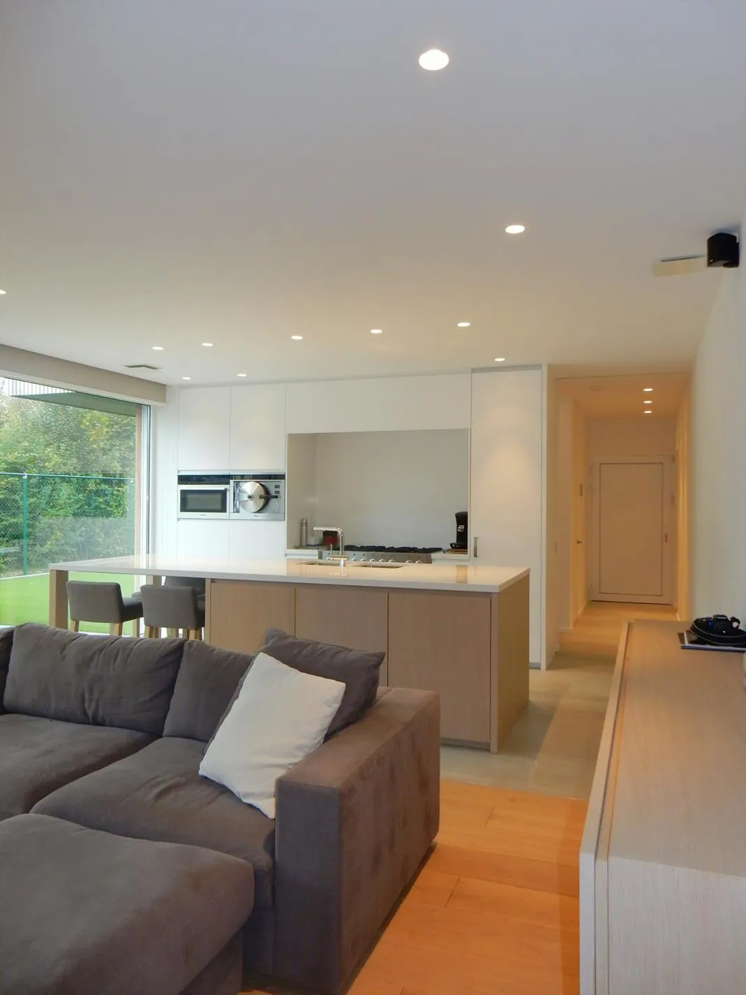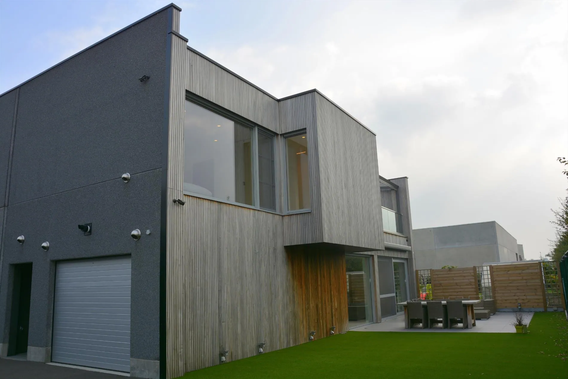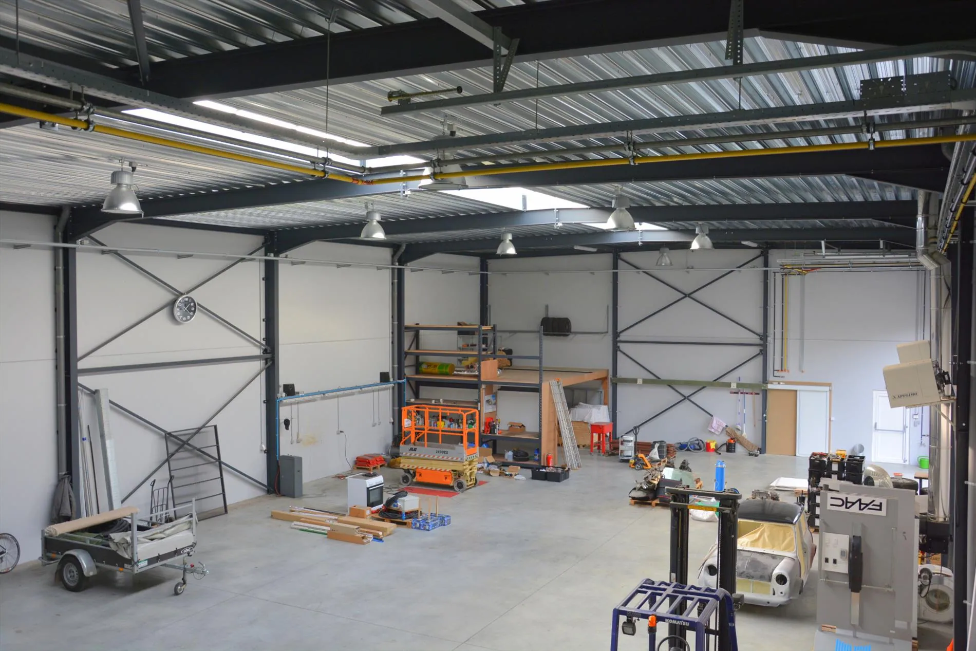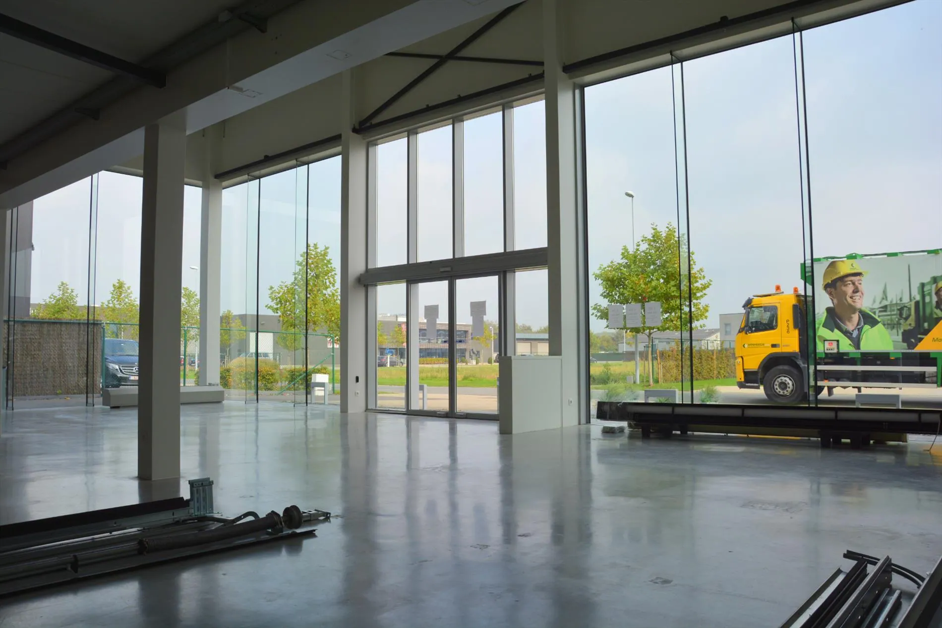 Dit bedrijfsgebouw is volledig nieuw en is opgesplitst in een lichtrijke toonzaal van 160m² met loods/atelier/hangar van 410m². De toonzaal is uitgerust met een keuken, archiefruimte, toilet, bureel, vloerverwarming en ventilatie. De hangar is uitgerust met een grote houtkachel, afzonderlijk toilet, 2 bergruimtes waaronder 1 voorzien met aansluiting voor wasmachine en droogkast en een autobrug. De loods staat volledig op regenwater! Boven de toonzaal is er een studio aanwezig die voorzien is van een woonkamer met pelletkachel, een kitchenette, een slaapkamer, een badkamer met inloopdouche en toilet en een grote bergruimte. De woning die enkele maanden geleden werd opgeleverd ligt achteraan het bedrijfsgebouw en is ingericht met veel smaak en charme. Er werden zeer veel kwalitatieve materialen gebruikt zoals eiken parket, de ingemaakte kasten zijn uitgerust met een fineerlaag van eik, schuifdeuren, zonneweringen, alarm, keramische vloeren, enz. De woning omvat een inkomhal, ingerichte compacte berging, gezellige woonkamer met ingemaakte kasten en een pelletkachel, volledig ingericht keukeneiland met een prachtig retrofornuis van Mercury, vaatwas, steamer, microgolf, dampkap en een composieten werkblad. Via de eiken designtrap gaat u naar boven waar u toekomt in de slaapkamer met grote dressing, infraroodcabine, moderne badkamer uitgerust met dubbele lavabo, inloopdouche met rainshower en ingemaakte kasten. Via de badkamer of de nachthal kan u naar het dakterras die afgewerkt is met bankirai, een jacuzzi, grote zonnewering en surround system. De woning is volledig uitgerust met zonneweringen, surround system, alarm, gordijnen enz. Er is ook nog een garage aanwezig. Achteraan werd de tuin aangelegd met kunstgras, een zonnig terras en is er mooie verlichting voorzien. Rondom de loods is er ook camerabewaking voorzien en de oprit kan volledig afgesloten worden met een elektrische hekken en/of slagboom.