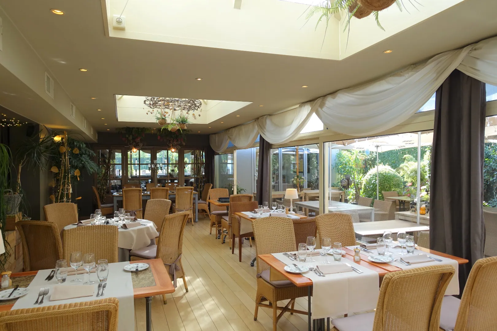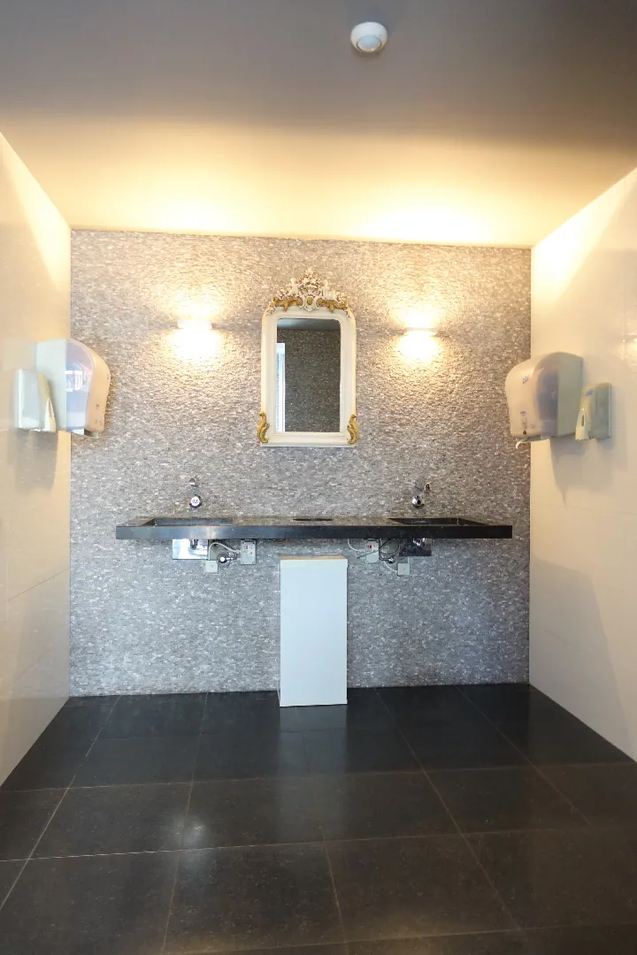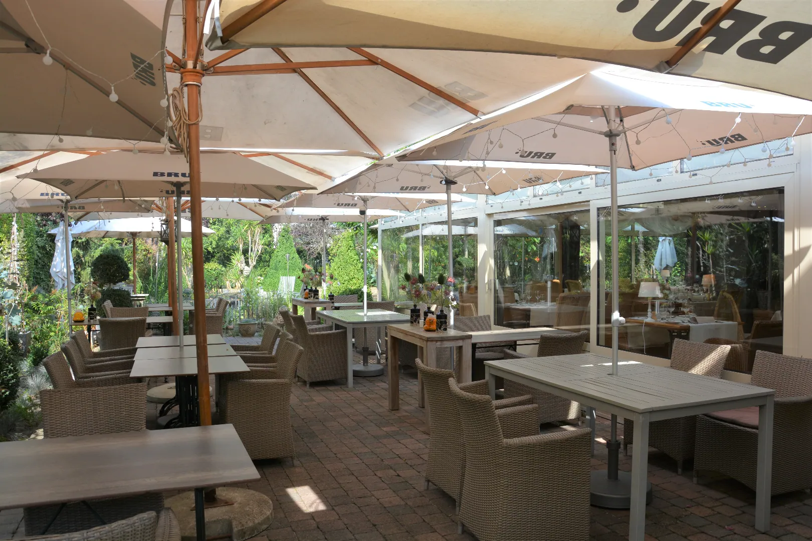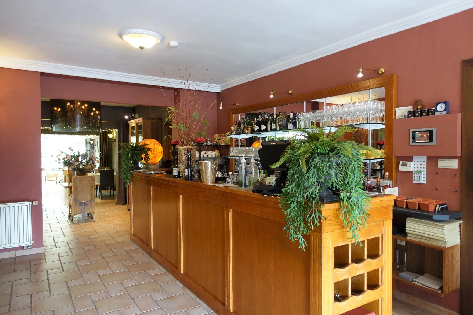 Gelijkvloers: Restaurant 281,30m² bestaand uit Inkomhal/sas, de ontvangstruimte met bar, trappenhal met extra berging, een prachtige eetzaal vooraan, een praktische tussenruimte, de grote veranda met zicht op terras en tuin, de volledig uitgeruste keuken, de technische ruimte en tot slot het sanitair. De keuken grenst aan de achtergelegen constructies waarbij de garage ingericht werd met een grote koelcel en de bijkomende bergingen gebruikt worden als koele stockageruimte voor alle dranken en terrasmateriaal. De karaktervolle, zonnige achtertuin wordt deels gebruikt als terras bij het restaurant, maar biedt extra mogelijkheden professioneel en privé.