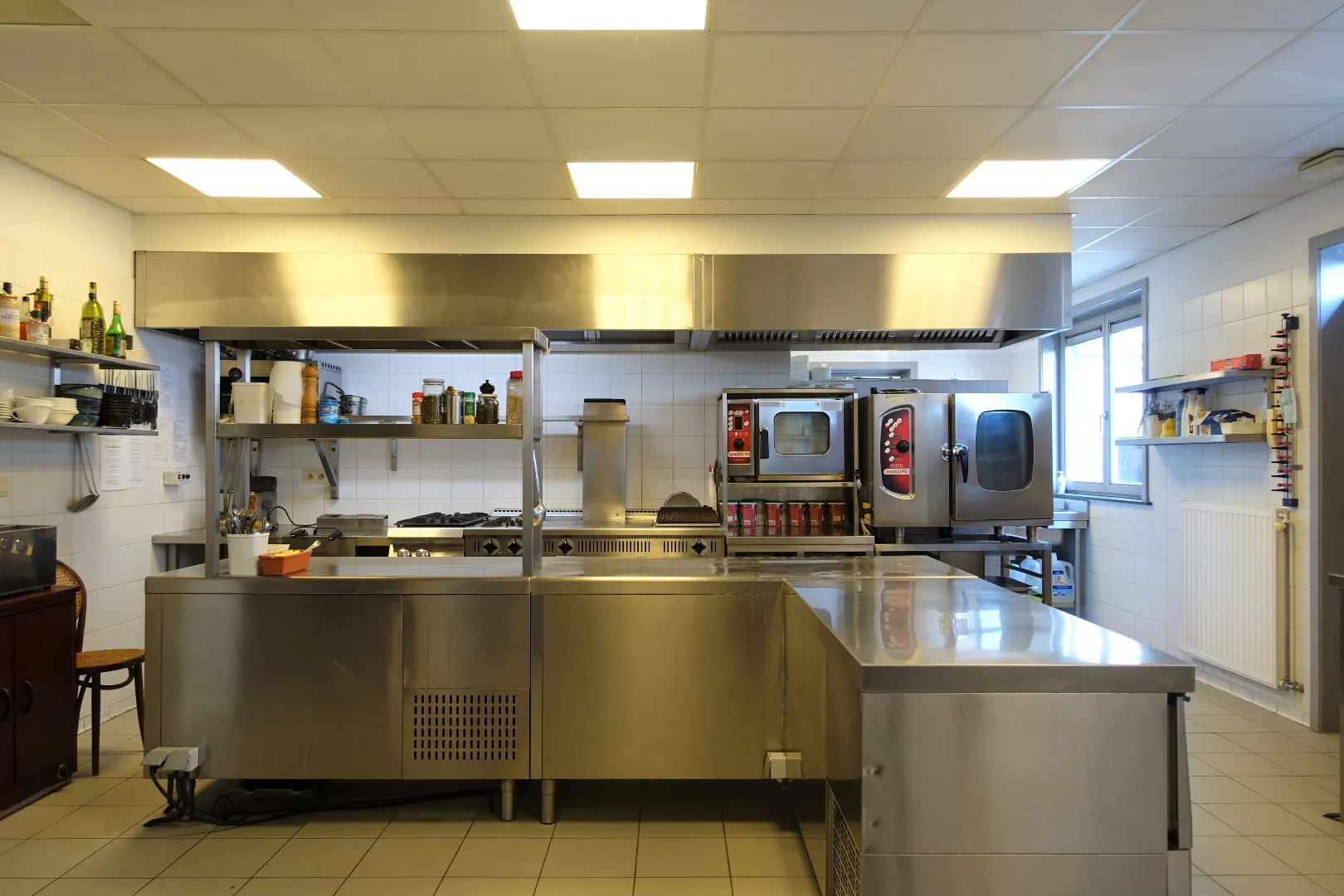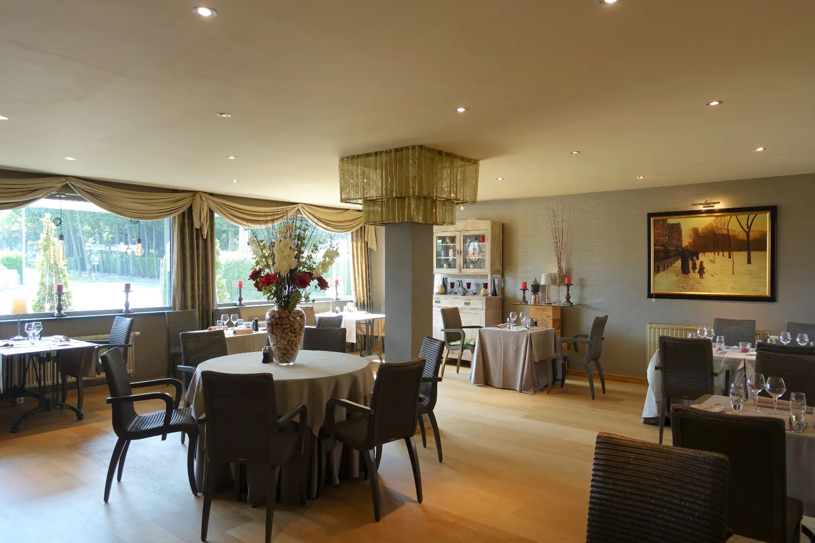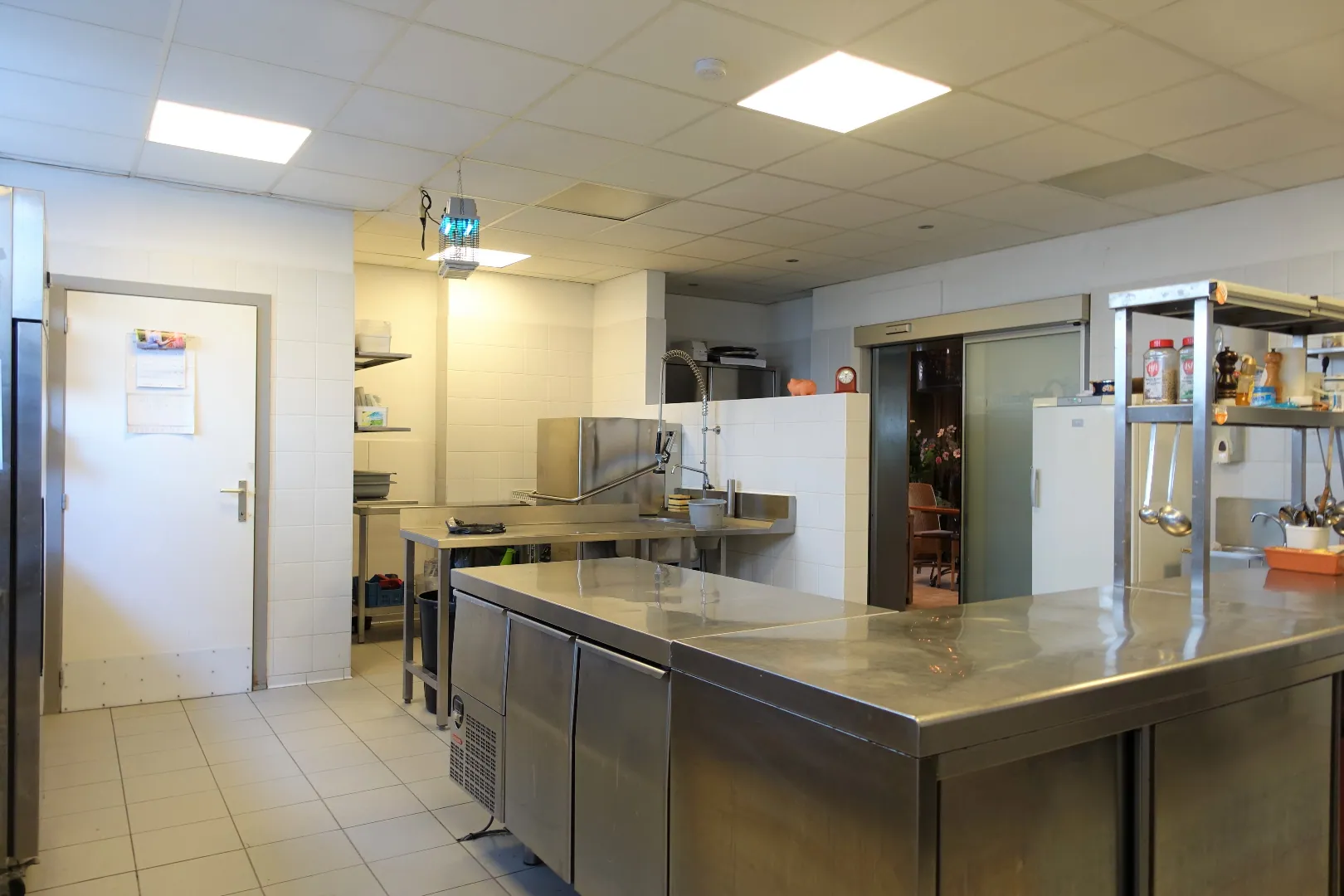 Gelijkvloers: Restaurant 281,30m² bestaand uit Inkomhal/sas, de ontvangstruimte met bar, trappenhal met extra berging, een prachtige eetzaal vooraan, een praktische tussenruimte, de grote veranda met zicht op terras en tuin, de volledig uitgeruste keuken, de technische ruimte en tot slot het sanitair. De keuken grenst aan de achtergelegen constructies waarbij de garage ingericht werd met een grote koelcel en de bijkomende bergingen gebruikt worden als koele stockageruimte voor alle dranken en terrasmateriaal. De karaktervolle, zonnige achtertuin wordt deels gebruikt als terras bij het restaurant, maar biedt extra mogelijkheden professioneel en privé.