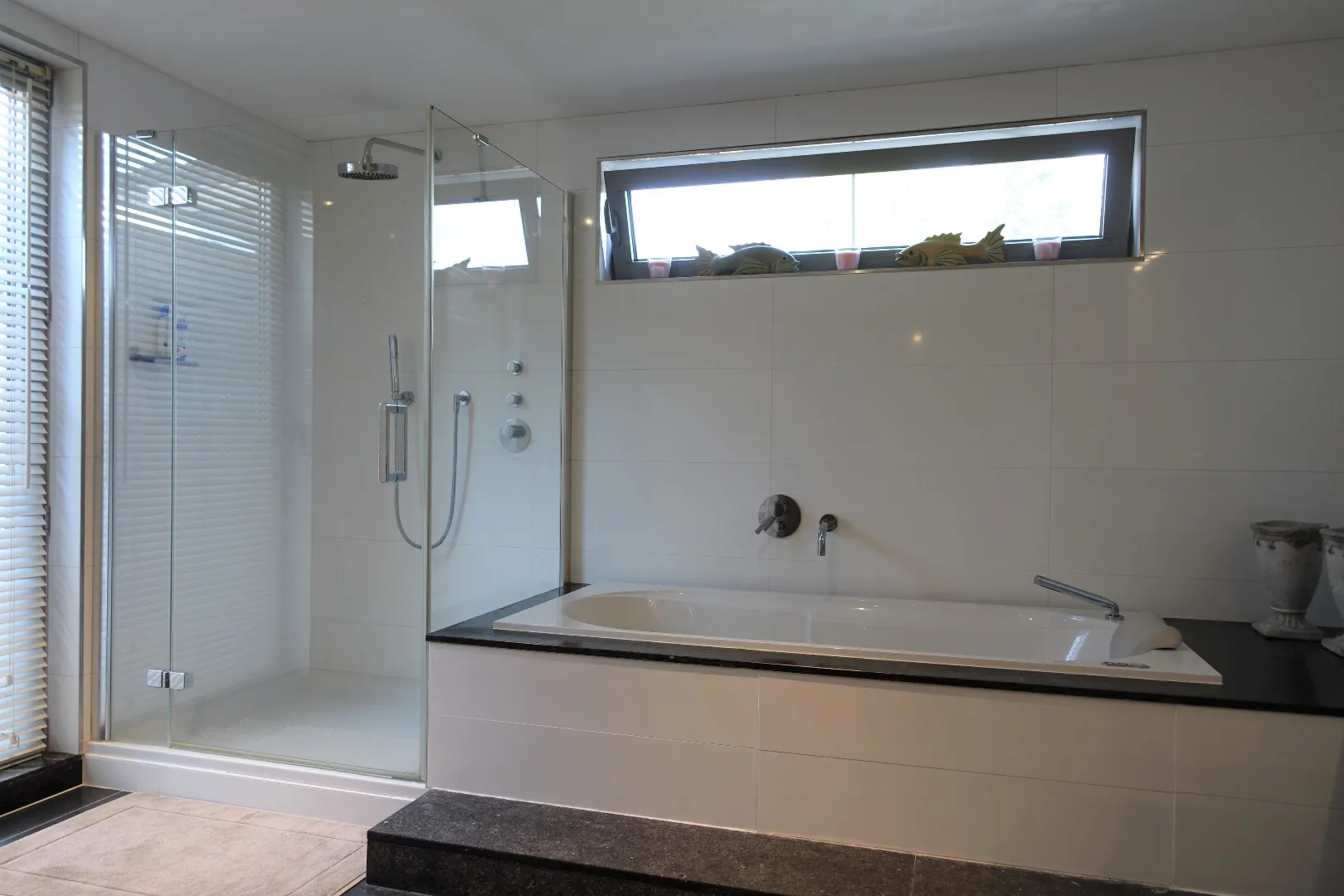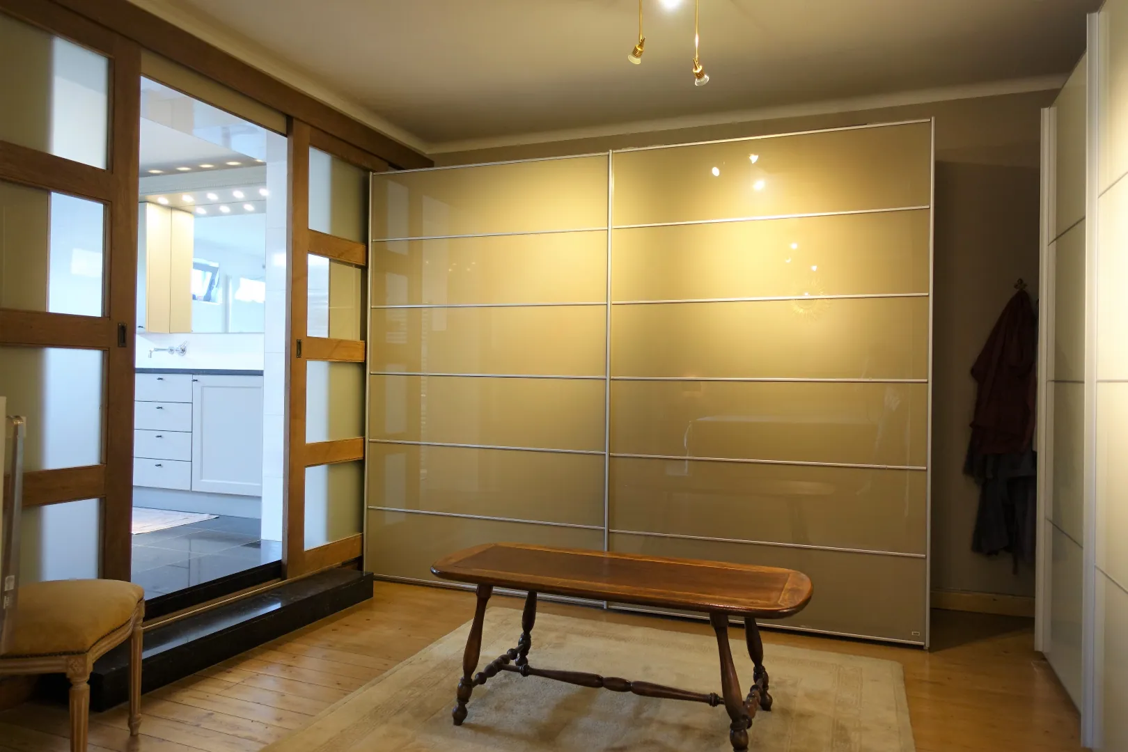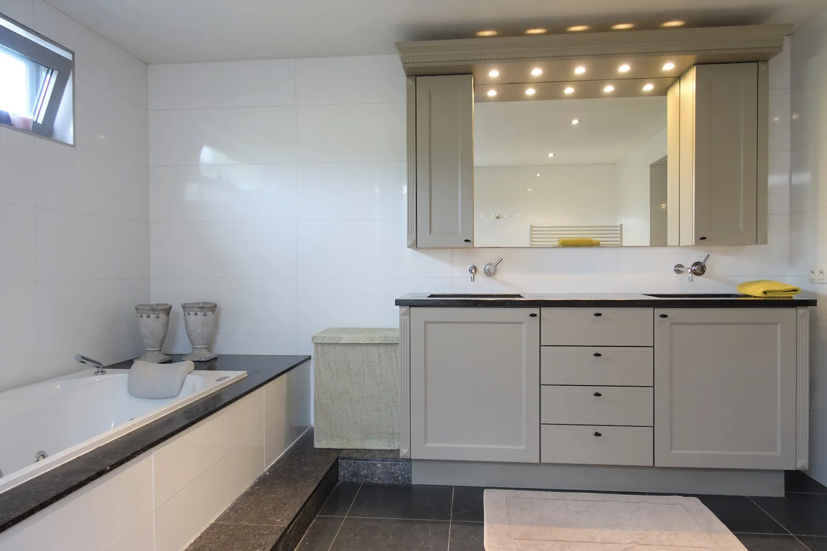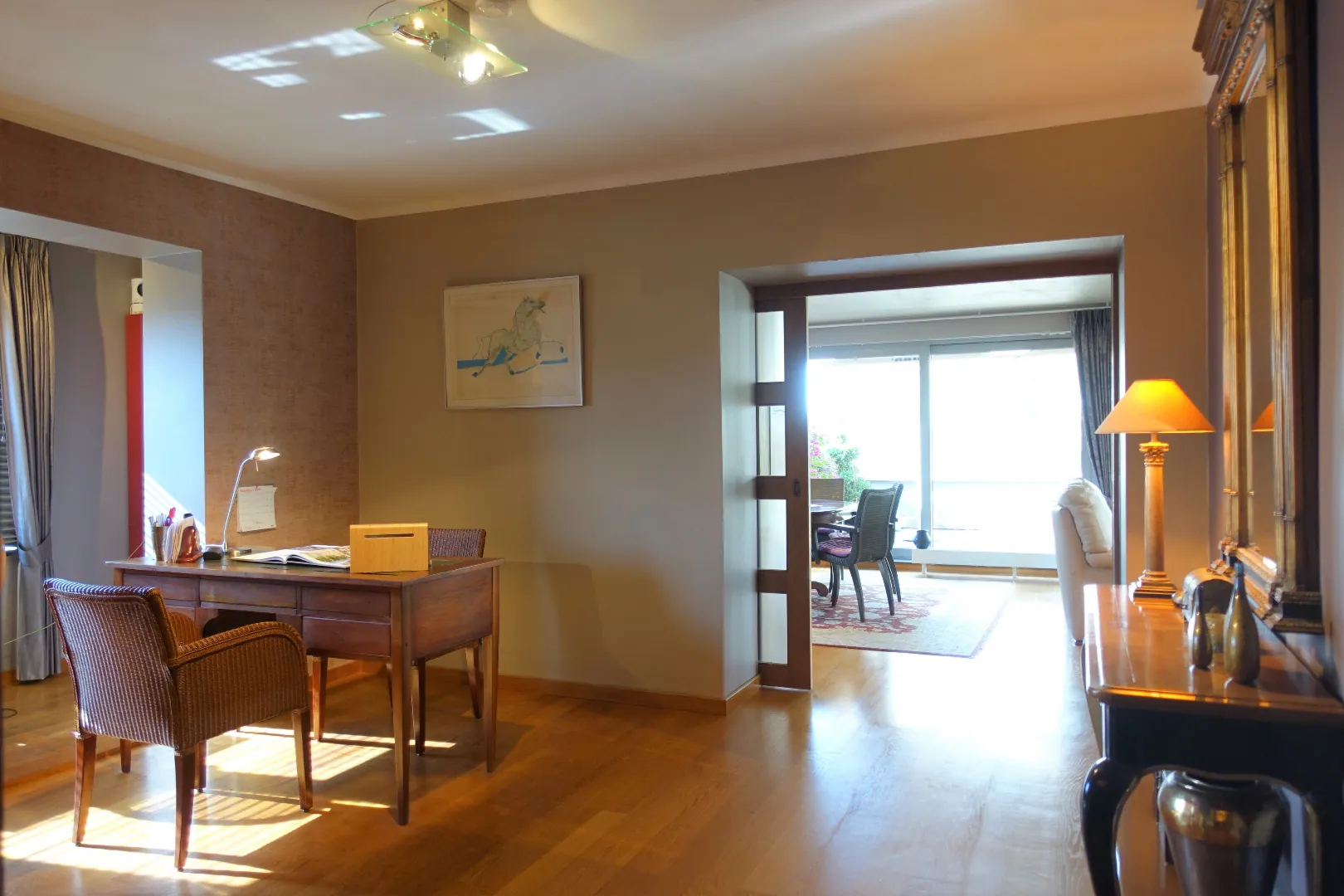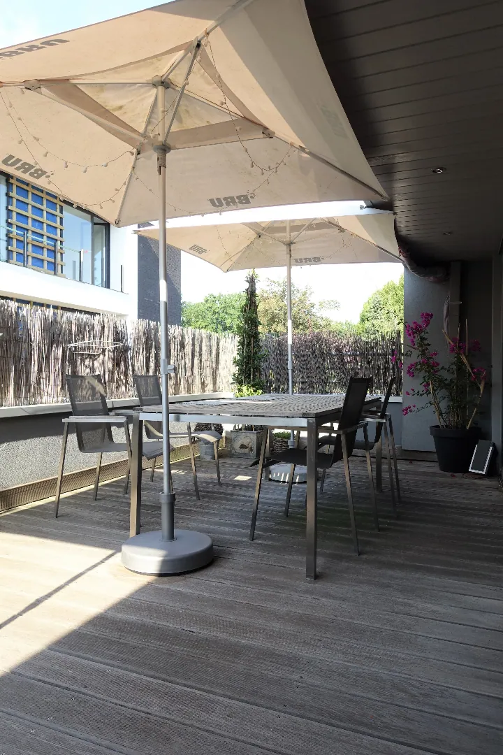 1e Verdieping: Appartement 110,47m² met private buitenruimte bestaand uit de trappenhal, een open ontvangstruimte die ingericht werd als bureel, de sfeervolle leefruimte met grote schuiframen naar het groot terras (24m²), de grote slaapkamer (14,24m²) met open dressingruimte (13,09m²) en privaat terras (11,84m²), een prachtig afgewerkte badkamer met dubbel lavabomeubel-groot ligbad-douche-hangtoilet en tot slot een polyvalente, in te richten ruimte waar een keuken kan geplaatst worden.