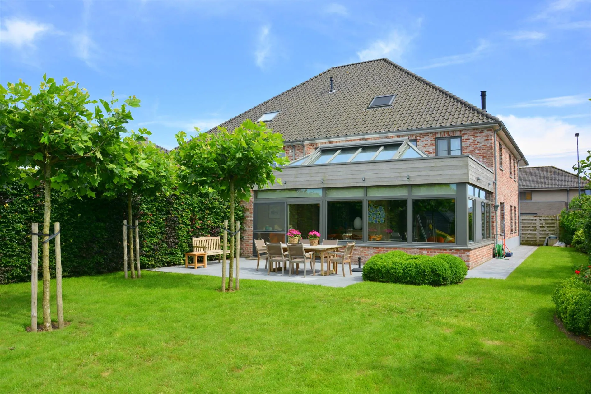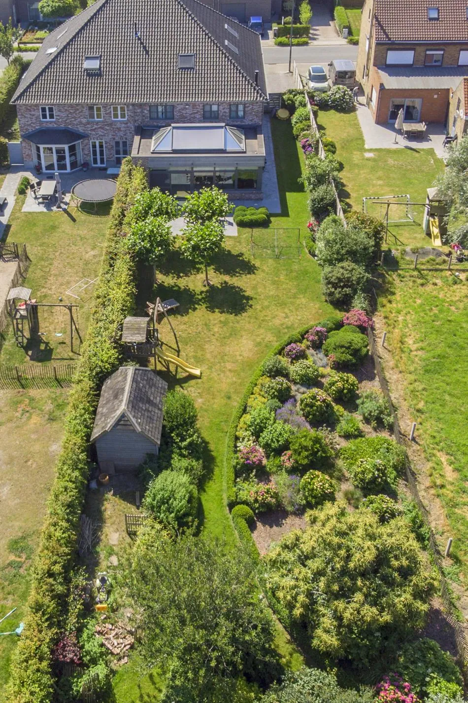 In een rustige straat nabij het centrum van Aartrijke, treffen we deze prachtige instapklare villa op een perceel van 1.000m². Deze woonst werd gebouwd in 2005 en onderging sindsdien enkel maar opwaarderingen. De woning wordt op het gelijkvloers ingedeeld in een ruime inkomhal met apart toilet, een prachtig ruime leefruimte met bureauhoek en pelletkachel, een half-open volledig ingerichte keuken, een grote lichtrijke uitbouw voorzien van automatische zonnewering, een ruime wasplaats, de inpandige garage met automatische sectionaalpoort. Via een eiken trap vanuit de inkomhal bereiken we de luchtige nachthal die toegang biedt aan 3 slaapkamers, een 2de toilet, een dressing (die kan ingericht worden als tweede badkamer, de leidingen liggen namelijk klaar) en een klassevolle badkamer met dubbel lavabo, ligbad en douche/stoomcabine. De 2de verdieping is opnieuw bereikbaar via een vaste trap vertrekkend vanuit de nachthal en biedt nogmaals plaats aan voor 1 slaapkamer en een grote open hobbyruimte (die eventueel nog kan ingericht worden als extra slaapkamer) met bergplaats. Verder geniet deze eigendom van een prachtig aangelegde afgesloten groene tuin met zonnig terras in blauw steen, open zicht met tuinhuis en schommel. De woning is afgewerkt met duurzame materialen zoals parket, volkeramische italiaanse tegels, 18 zonnepanelen en een waterverzachter. Ook bevat deze villa een oprit voor drie wagens. Kom deze topper snel ontdekken!
