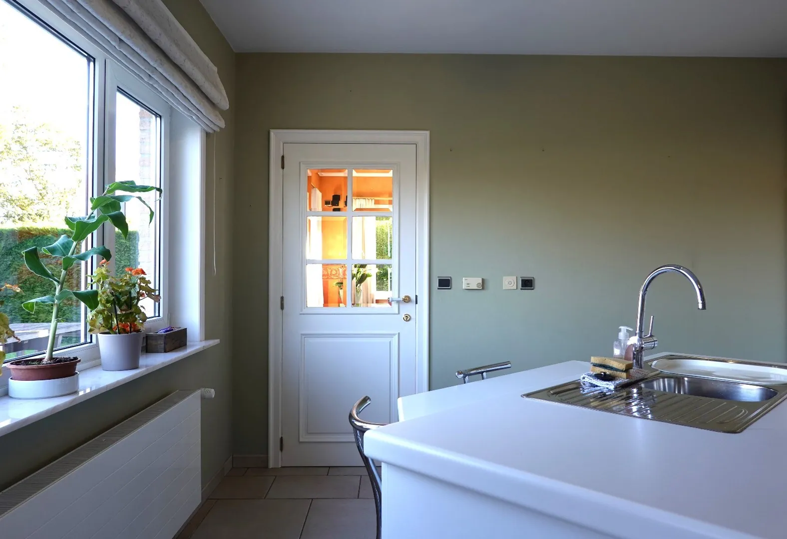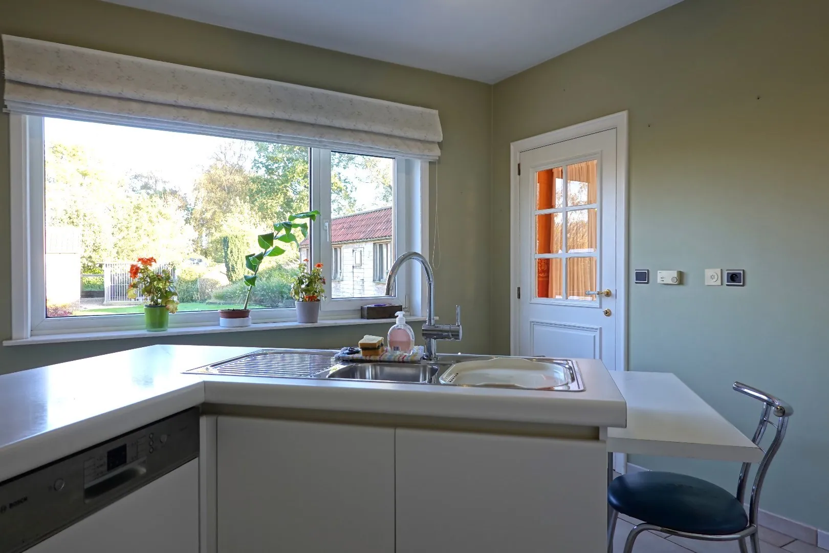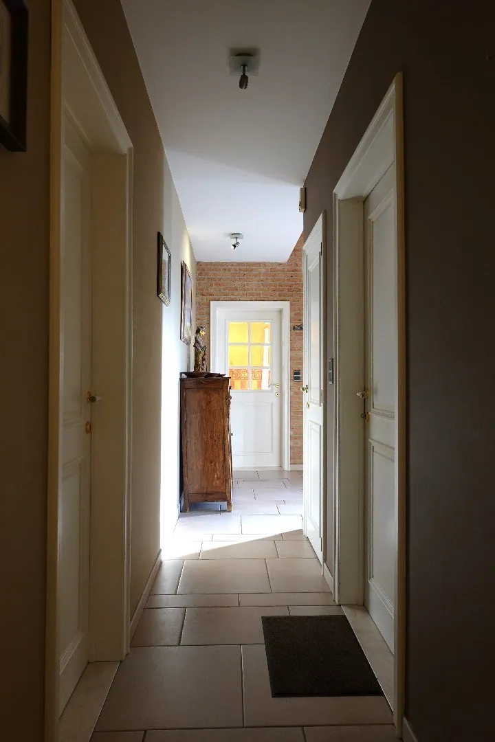 U betreedt de villa via de ruime inkomhal aan de voorzijde. Vanuit de hal met gastentoilet bereikt u de gezellige woonkamer voorzien van schouw met natuurhaard en verbonden met de oost-georiënteerde aangelegde tuin. Via de leefruimte komt u in de volledig geïnstalleerde keuken met aansluitend de ruime wasplaats die toegang biedt naar de tuin. Vanuit de wasplaats komt u terug in de inkomhal waar een bureelruimte/slaapkamer is gelegen, badkamer met ligbad en de