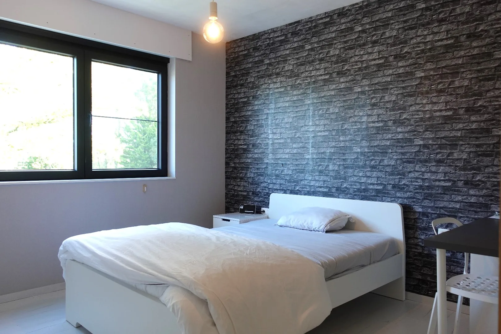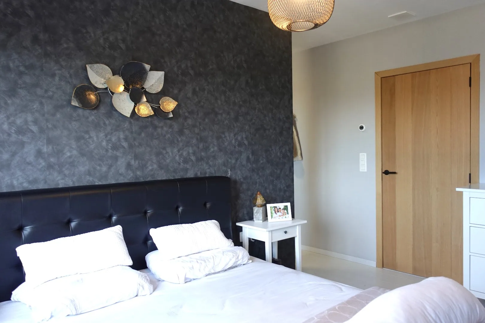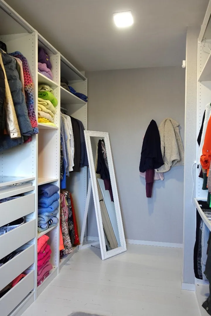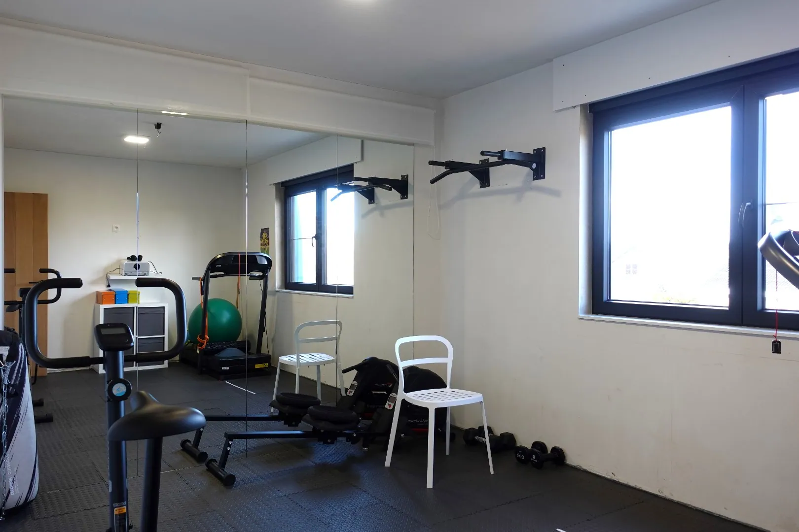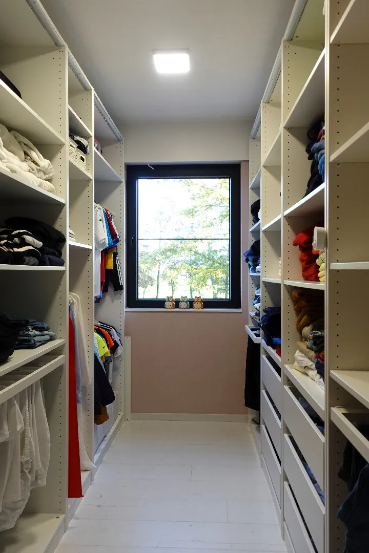 Via de strakke, open trap bereikt u het eerste verdiep waar zich de ruime master bedroom met dressing bevindt. De badkamer werd uitgerust met een dubbele lavabo en ruime inloopdouche. Verder bevinden zich nog 3 ruime slaapkamers, een dressing, opbergruimte, een vierde slaapkamer die momenteel dienst doet als fitnessruimte alsook een afzonderlijk toilet.