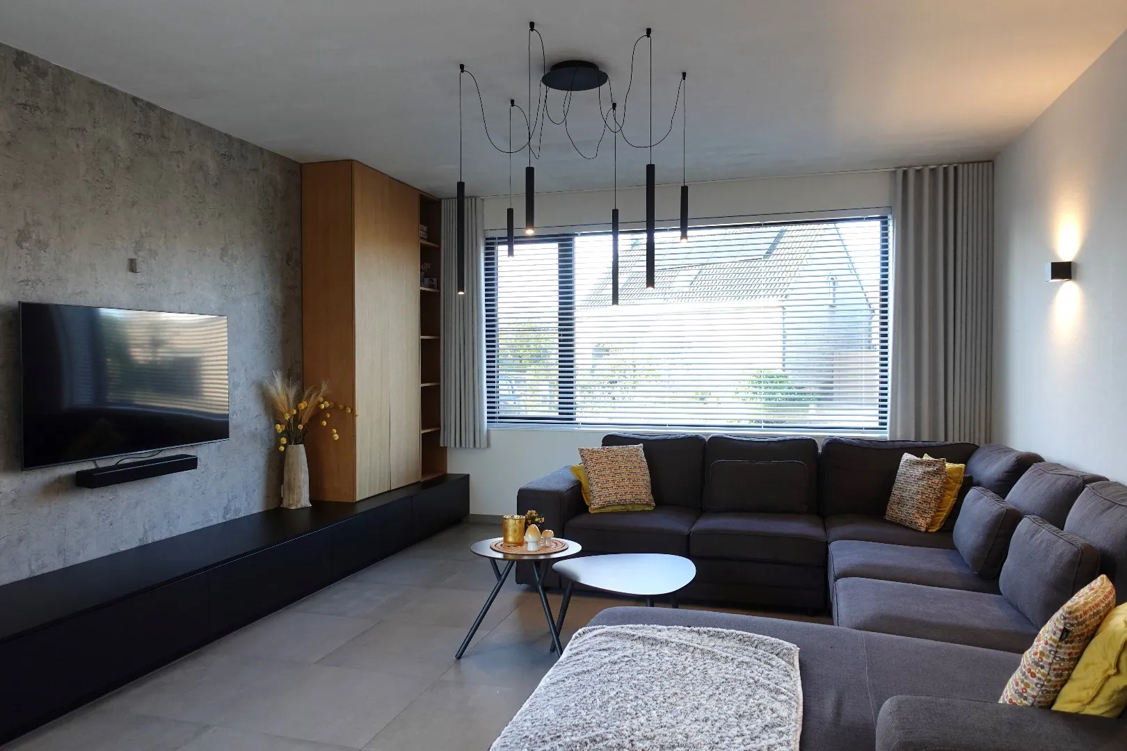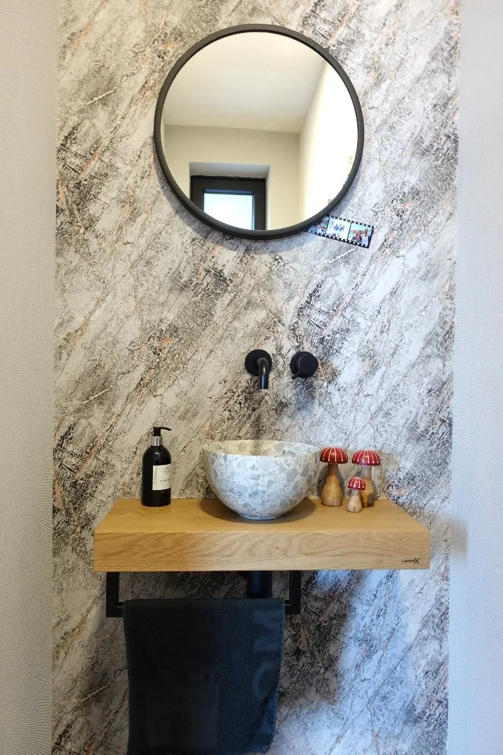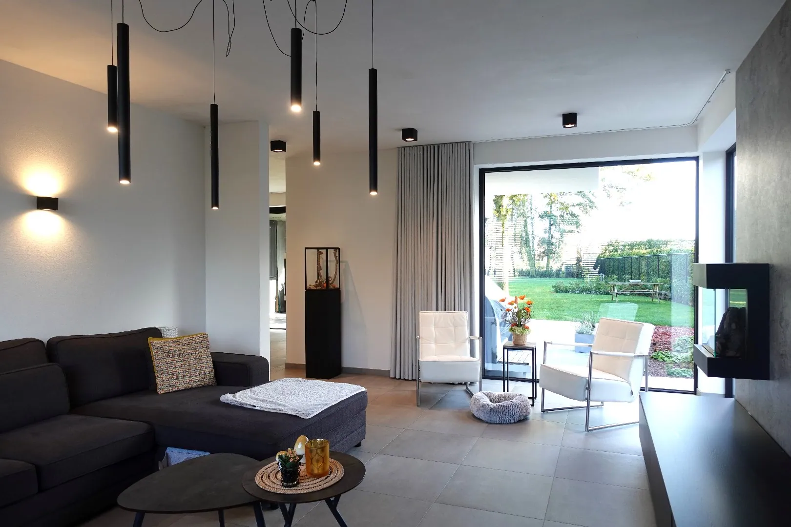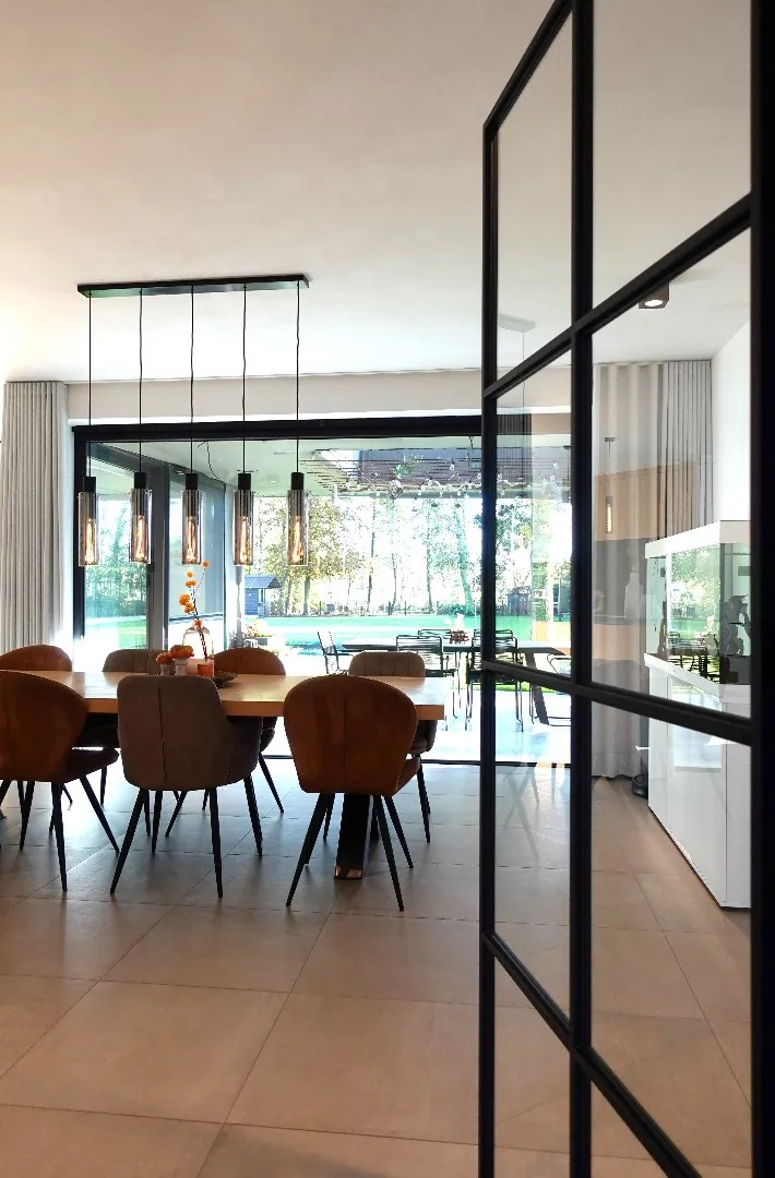 Via de ruime inkomhal, voorzien van gastentoilet met design wastafel en een bureelruimte met ingemaakte kastenwand, betreedt u de lichtrijke en hedendaagse leef- en eetruimte. Aansluitend treft u de open, volledig uitgeruste keuken met ontbijthoek en de knusse zithoek met vast tv-meubel en sierhaard die zicht geeft op de Noord-oost georiënteerde tuin en het aangelegde terras. Verder biedt het gelijkvloers een praktische wasplaats met ruimte voor alle technieken, een ontspanningsruimte met hoekbad, inloopdouche & toilet en een inpandige garage met geautomatiseerde sectionaalpoort.