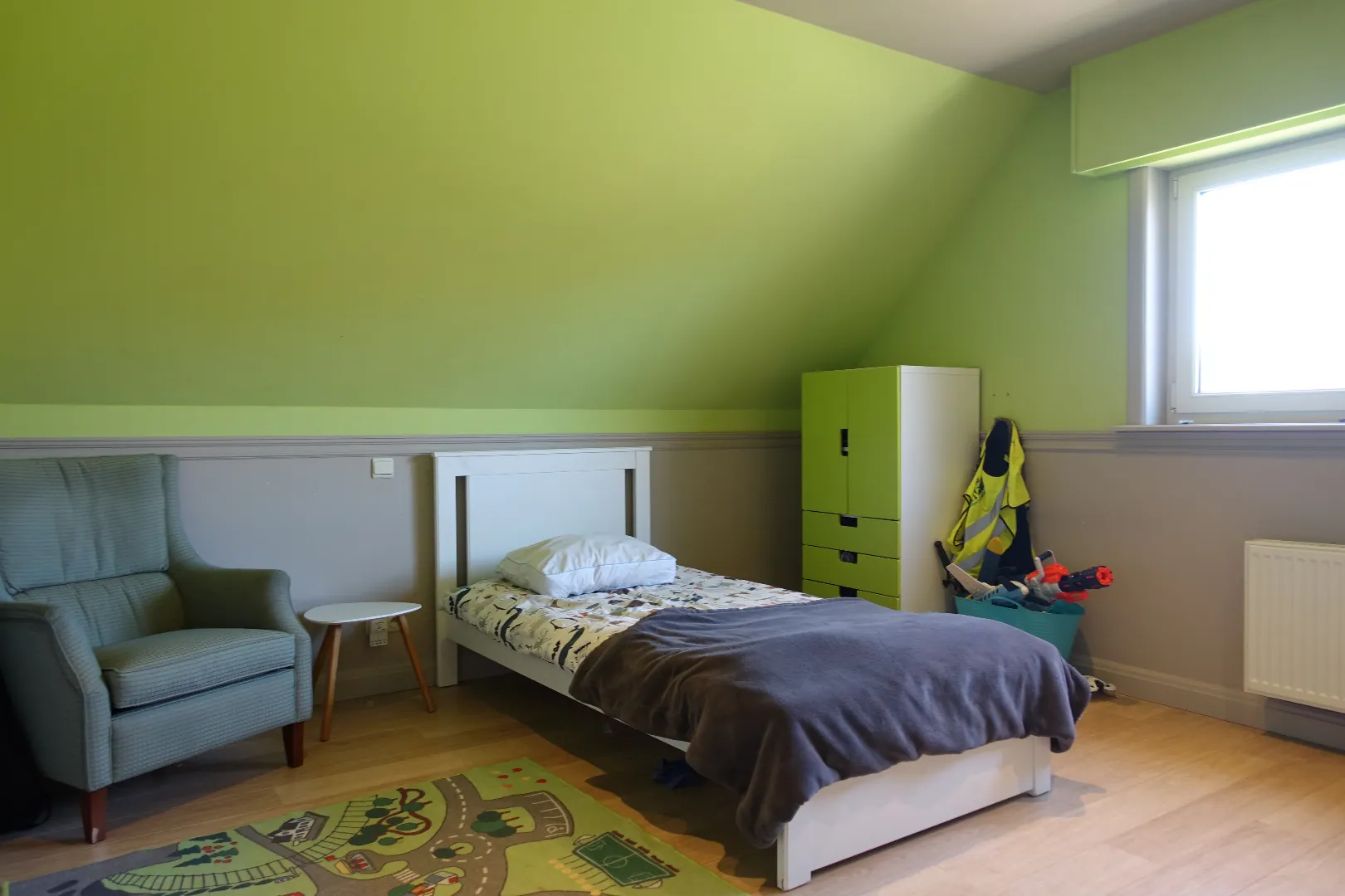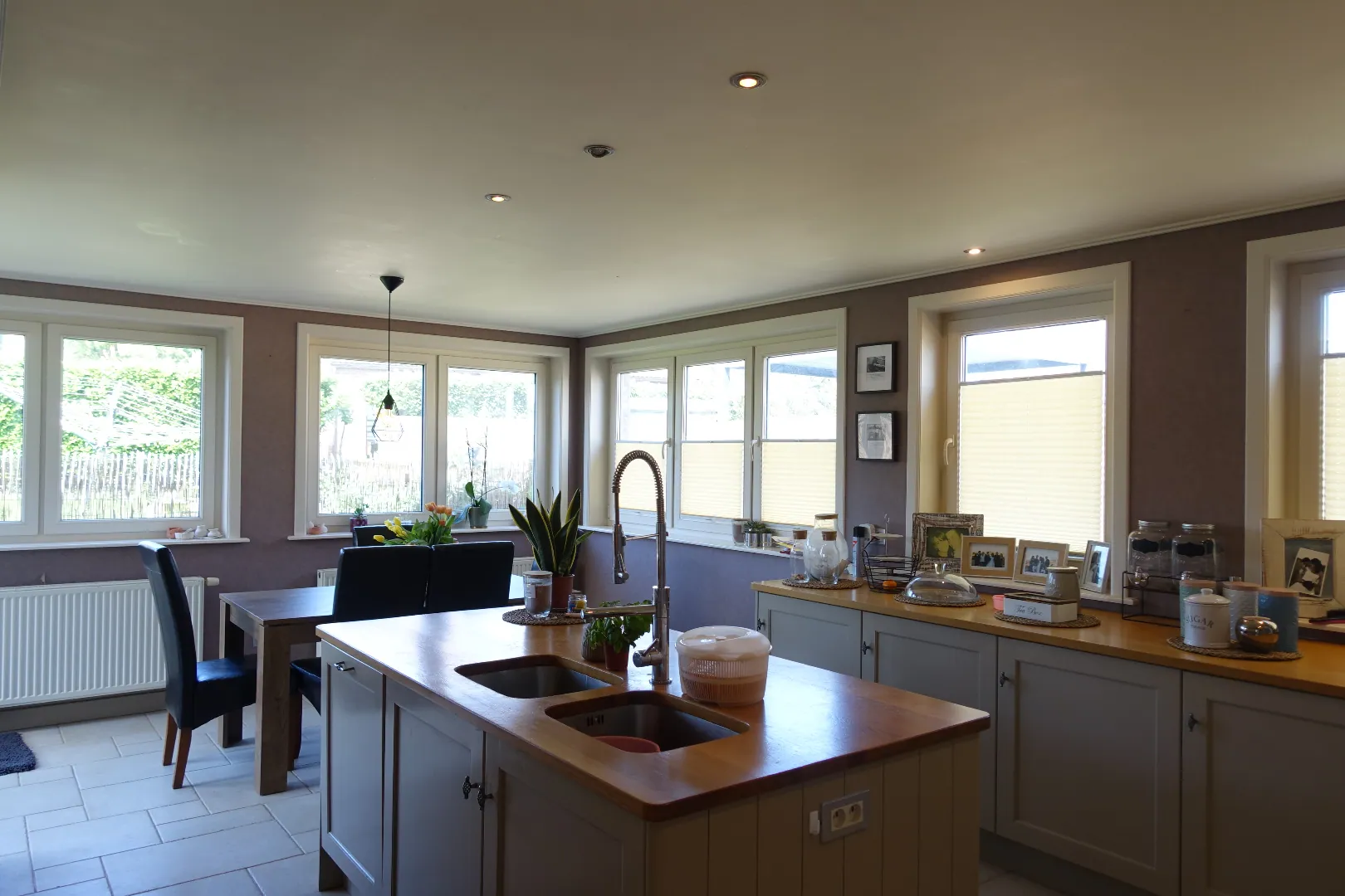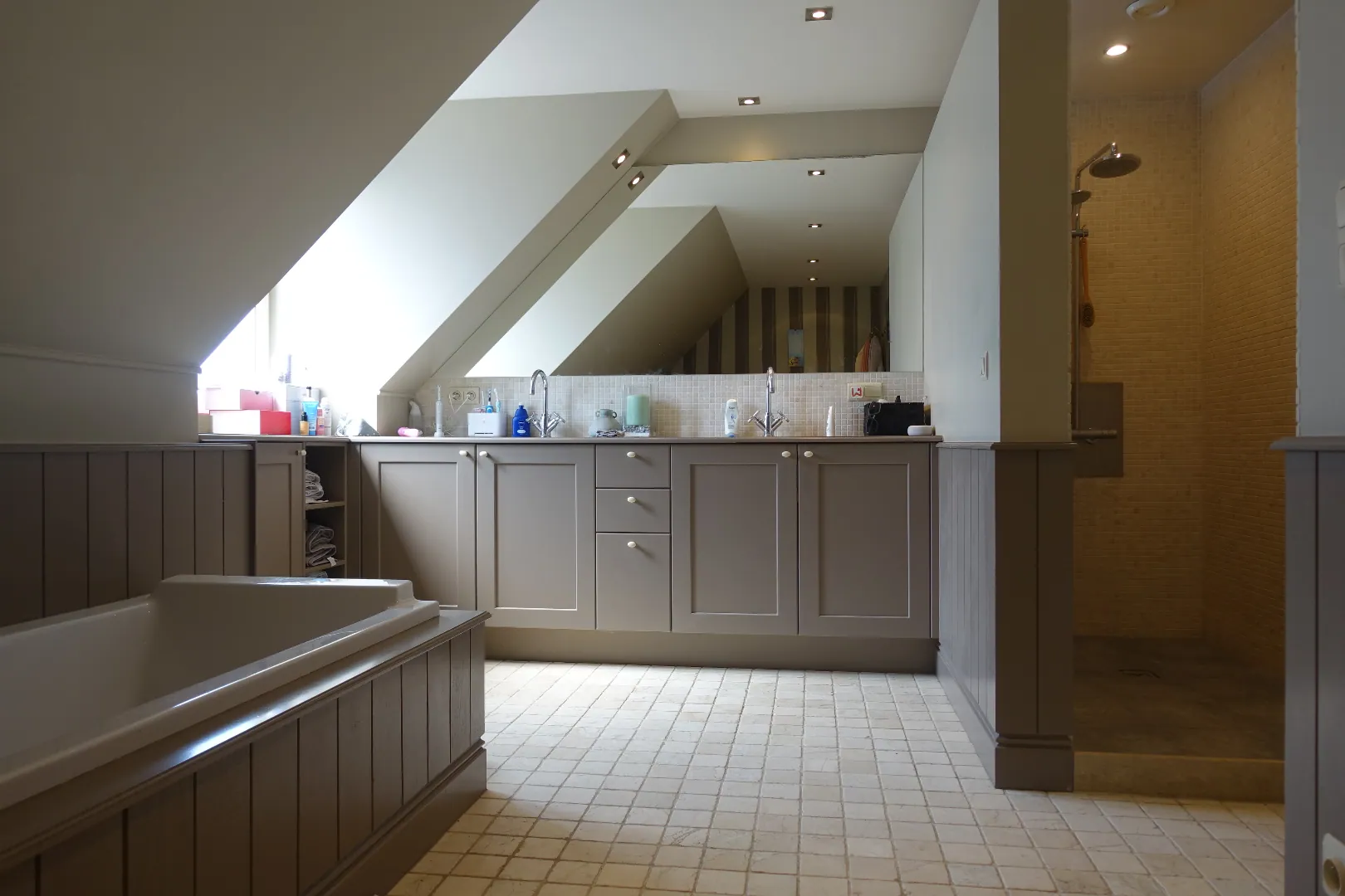 Ruime inkomhal met karaktervolle houten trap en apart toilet, de lichtrijke leefruimte voorzien van parketvloer, een bureelruimte of gelijkvloerse slaapkamer, de ruime leefkeuken met eiland en toegang tot de tuin, een extra inkomhal op de zijgevel, de wasplaats, extra bergruimte en de inpandige garage met geautomatiseerde sectionaalpoort. De 1e verdieping biedt plaats aan maar de prachtige badkamer met 2e toilet, dubbel lavabomeubel, ligbad en inloopdouche, 3 slaapkamers en tot slot de master slaapkamer met dressingruimte en privé-terras. De geïsoleerde zolder (35,29m²) is toegankelijk via een vaste trap.