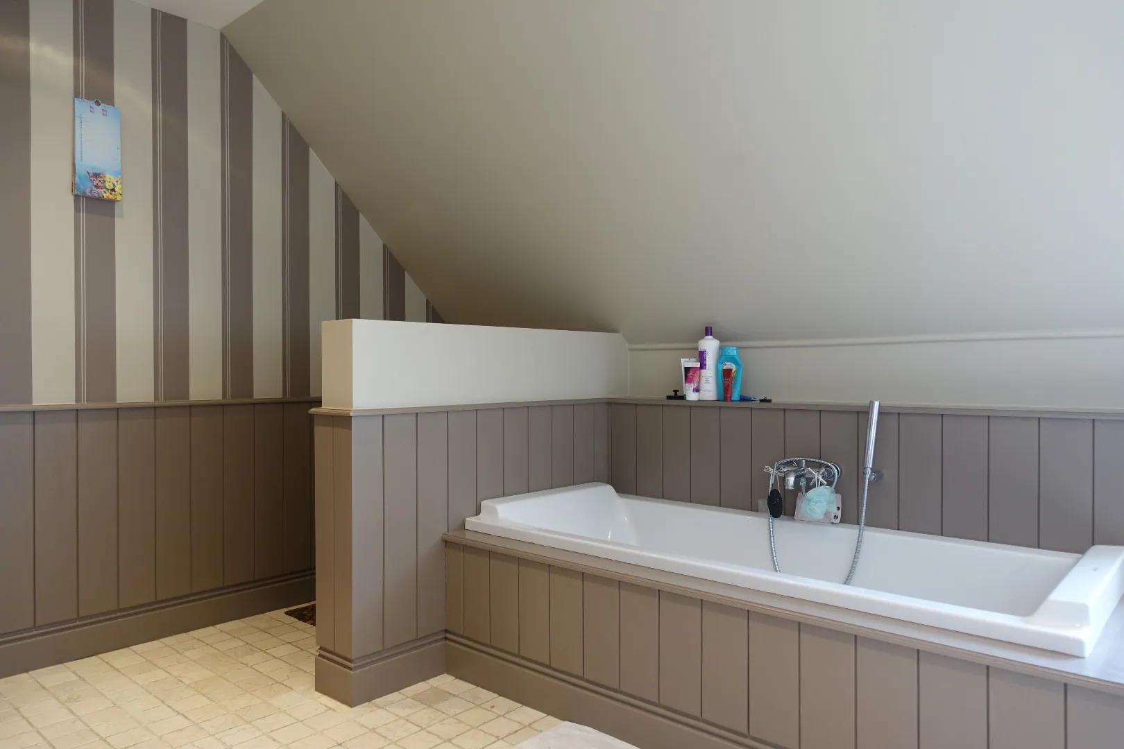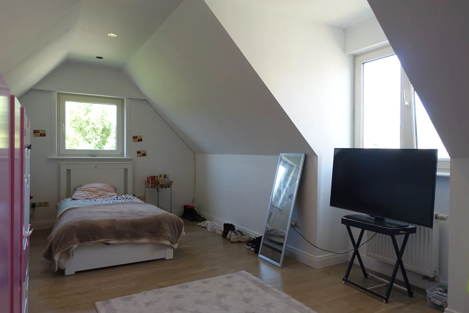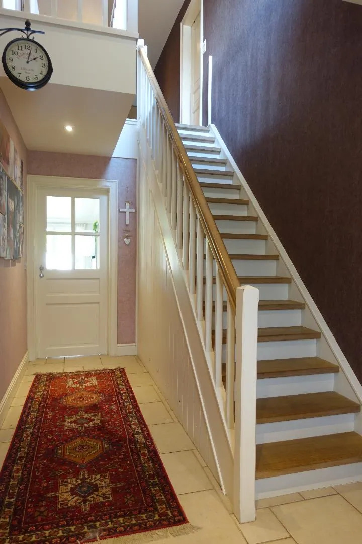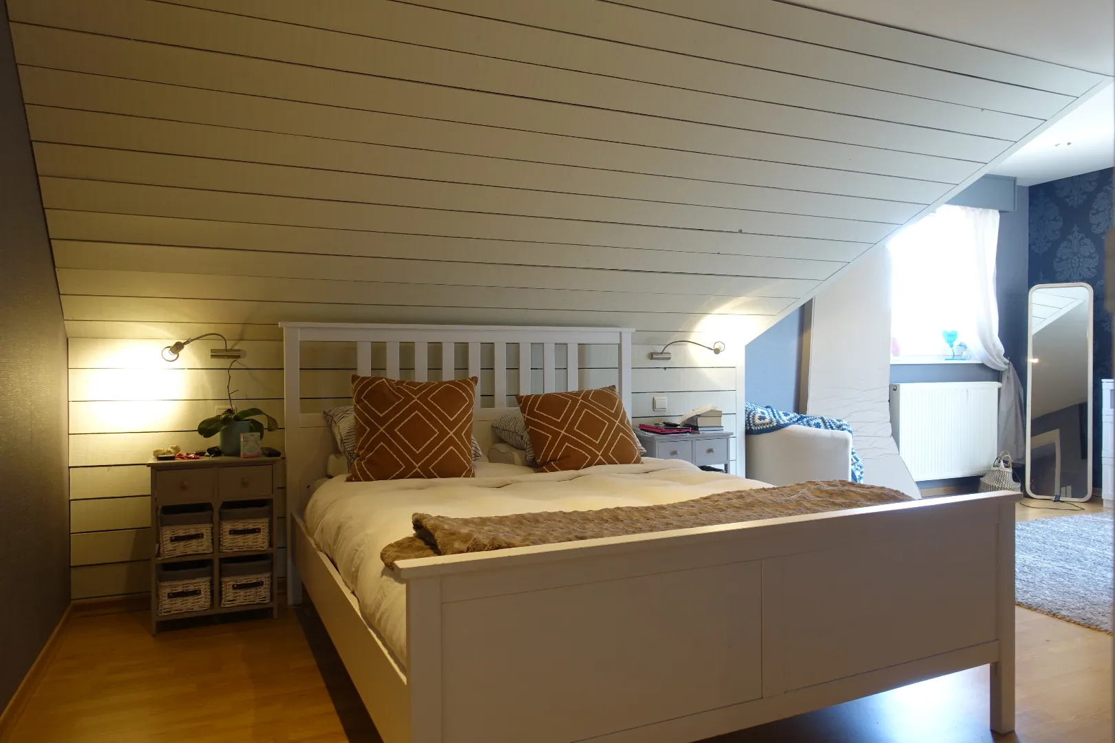 Ruime inkomhal met karaktervolle houten trap en apart toilet, de lichtrijke leefruimte voorzien van parketvloer, een bureelruimte of gelijkvloerse slaapkamer, de ruime leefkeuken met eiland en toegang tot de tuin, een extra inkomhal op de zijgevel, de wasplaats, extra bergruimte en de inpandige garage met geautomatiseerde sectionaalpoort. De 1e verdieping biedt plaats aan maar de prachtige badkamer met 2e toilet, dubbel lavabomeubel, ligbad en inloopdouche, 3 slaapkamers en tot slot de master slaapkamer met dressingruimte en privé-terras. De geïsoleerde zolder (35,29m²) is toegankelijk via een vaste trap.