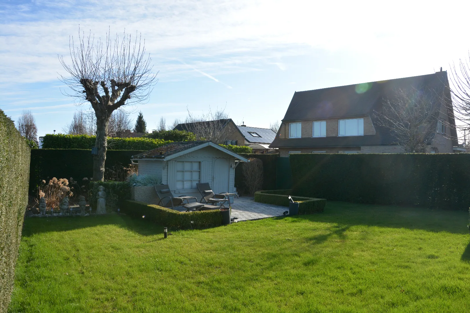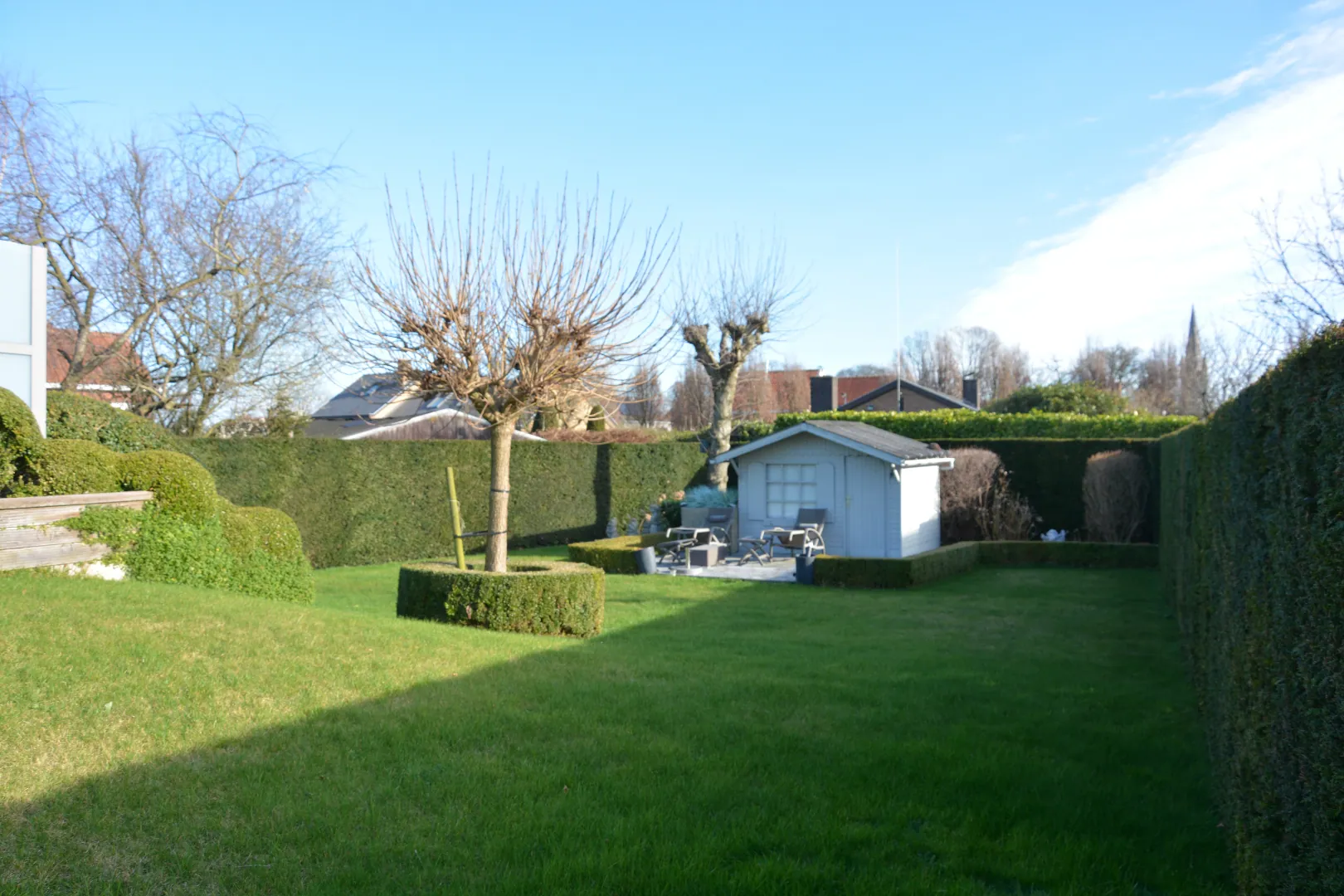 Verder beschikt de woning over een "kelderverdieping" van maar liefst 94m² die ingedeeld wordt in een garage met automatische sectionaalpoort, de wasplaats en 3 ruime berglokalen. De tuin met tuinhuis en 2e zonneterras is volledig aangelegd en zeer privé.