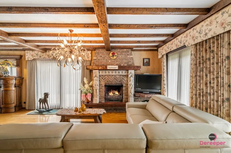 Binnenin beschikt de woning over een bewoonbare oppervlakte van 135 m². De ruime leefruimte straalt warmte en authenticiteit uit dankzij de prachtige volle eiken balken, die het interieur een karaktervolle en gezellige uitstraling geven. De bungalow biedt daarnaast nog 3 slaapkamers, een ingerichte badkamer, een bureau, een wasplaats en een ruime zolder die tal van mogelijkheden biedt, bijvoorbeeld als extra bergruimte (110 m²).