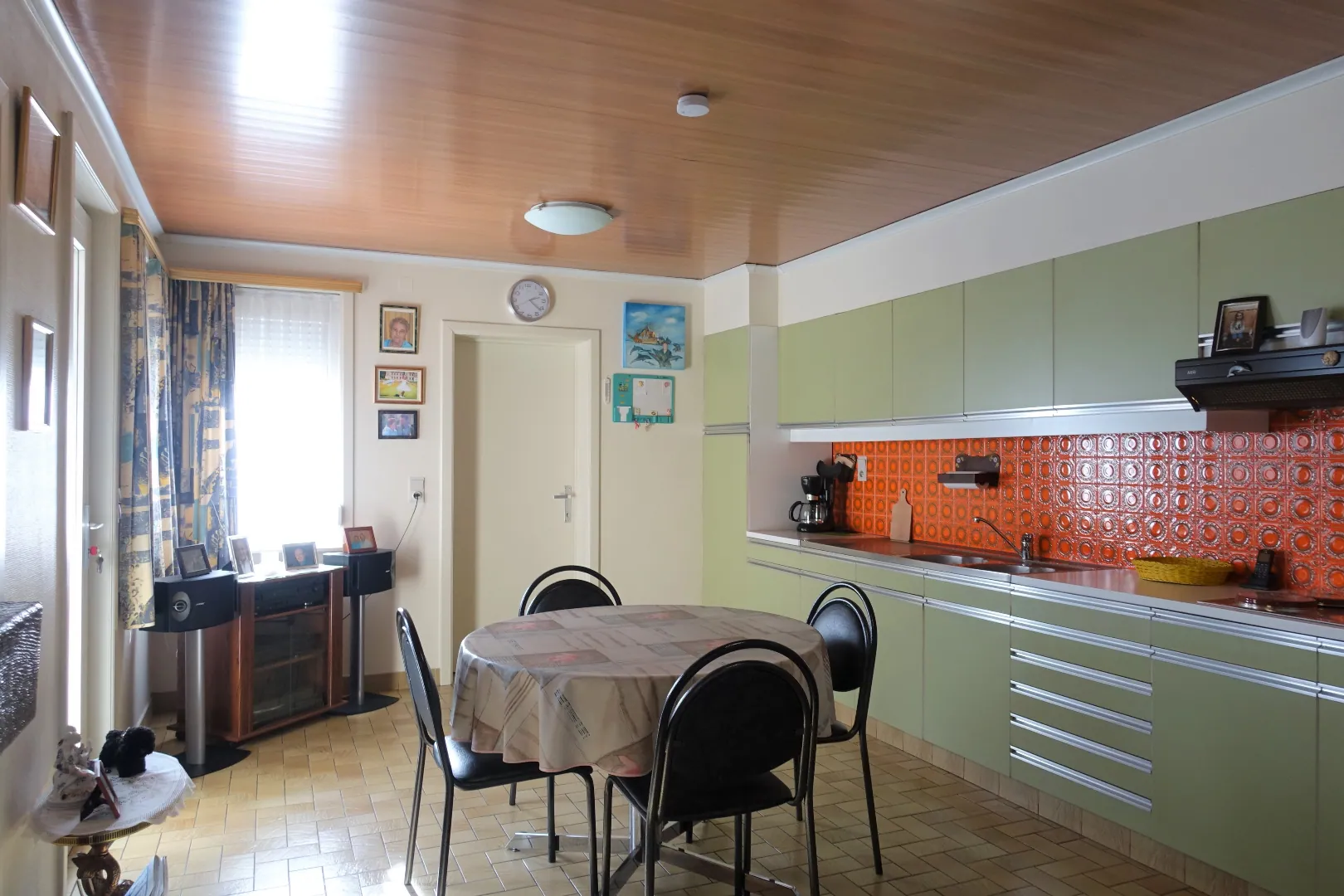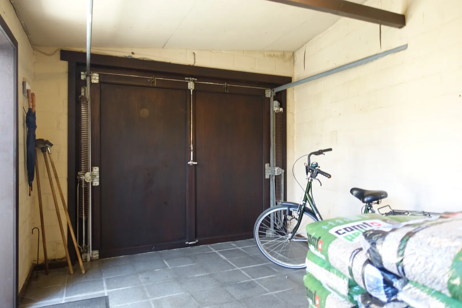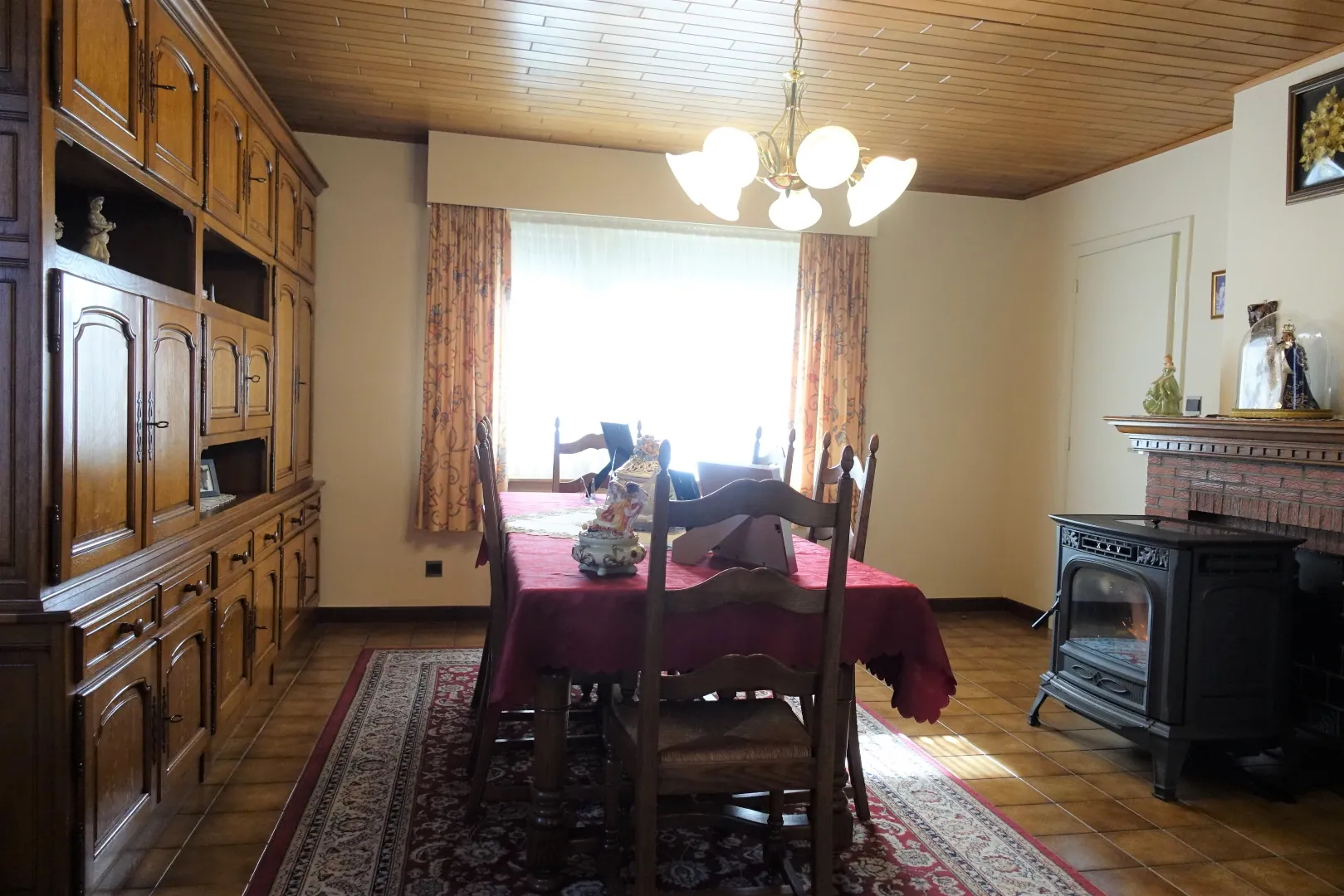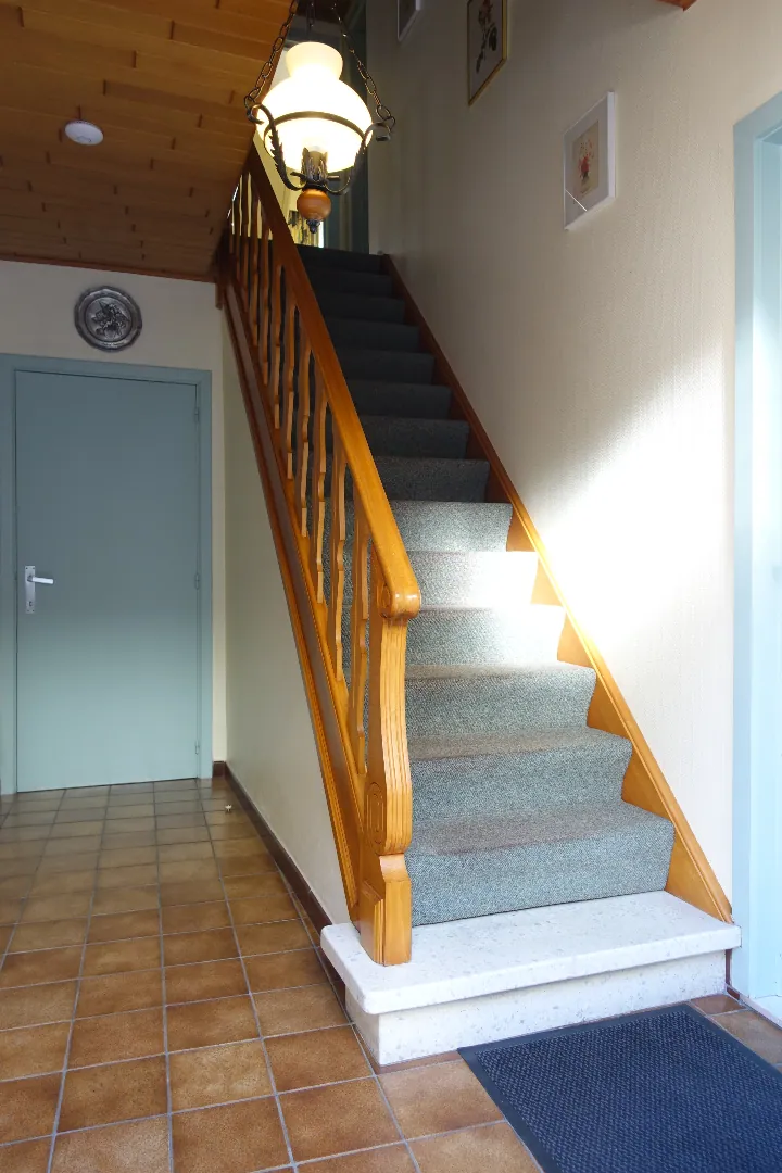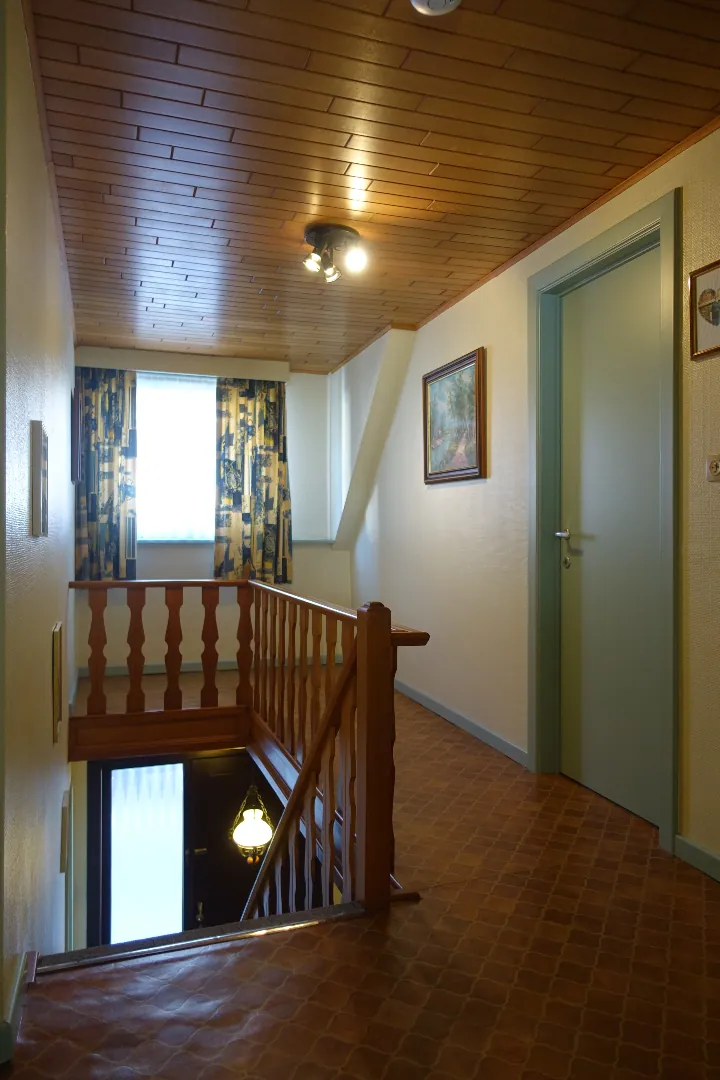 De centrale inkomhal, een grote polyvalente voorplaats, de grote leefkeuken, de lichtrijke eetplaats, een gezellige zithoek, de badkamer met toilet, een veranda met toegang tot de tuin en de aangebouwde garage/bergplaats. De 1ste verdieping wordt ingedeeld in een ruime nachthal die toegang biedt tot 4 volwaardige, grote slaapkamers. De zolder is toegankelijk via een luik en biedt extra bergplaats.